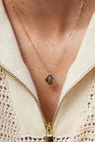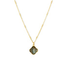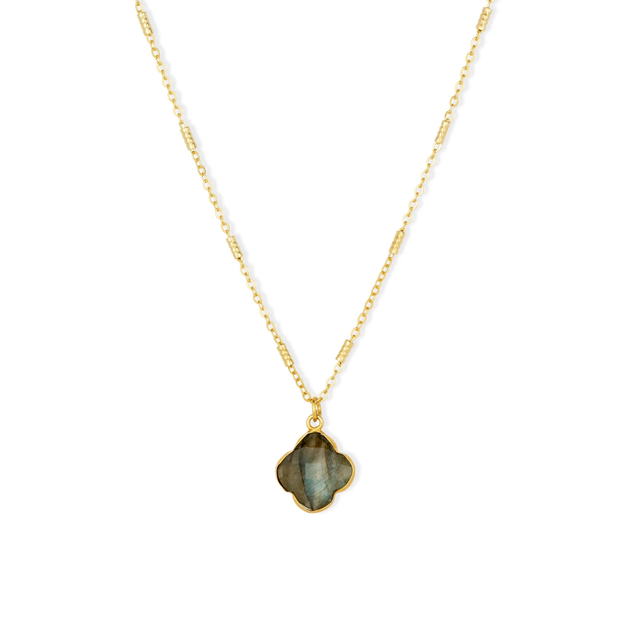 This necklace showcases a clover-shaped pendant made from Labradorite, a natural gemstone known for its shimmering grey tones. It hangs from a delicately crafted 22-carat gold-plated chain, blending sophistication with skilled artistry. Each necklace is carefully handmade, demonstrating precise craftsmanship and attention to detail.