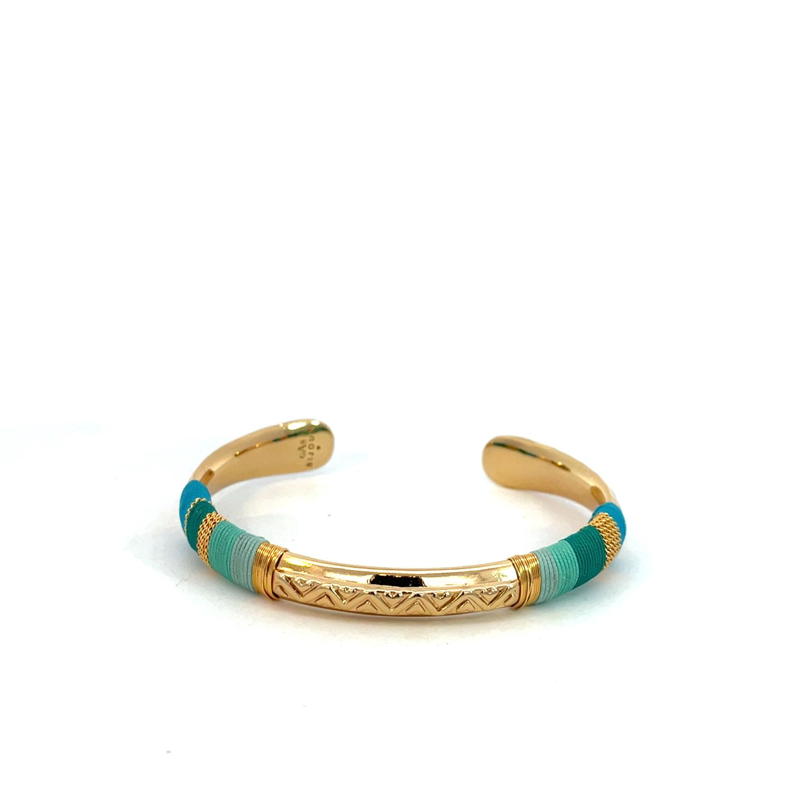 A signature Gas Bijoux piece inspired by travel and traditional craftsmanship. This slim gold-plated bangle is intricately wrapped with fine threads and gold wire, creating a textured design that blends organic and mineral elements. Elegant worn alone or layered into a bracelet stack for effortless bohemian style.