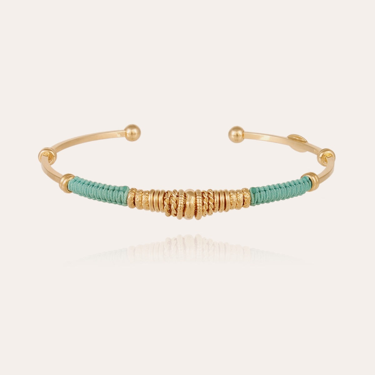 A signature piece from Gas Bijoux, this delicate gold-plated bracelet blends artisanal craftsmanship with effortless style. Wrapped with colourful threads and finished with a cluster of vintage-inspired rings, it creates a textured, layered look reminiscent of collected talismans. Elegant worn alone or stacked with other bracelets for a relaxed bohemian feel.
