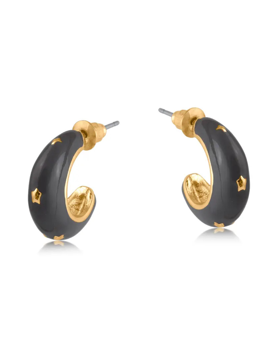 Bring a playful twist to classic hoops with these two-tone half-hoop earrings, featuring embossed star details and a glossy enamel coating. The mix of finishes adds subtle dimension, while surgical steel posts ensure comfort and safety for sensitive ears. Perfect for everyday wear or adding a whimsical, modern touch to your evening looks, these earrings are a sparkling way to show off your style.
