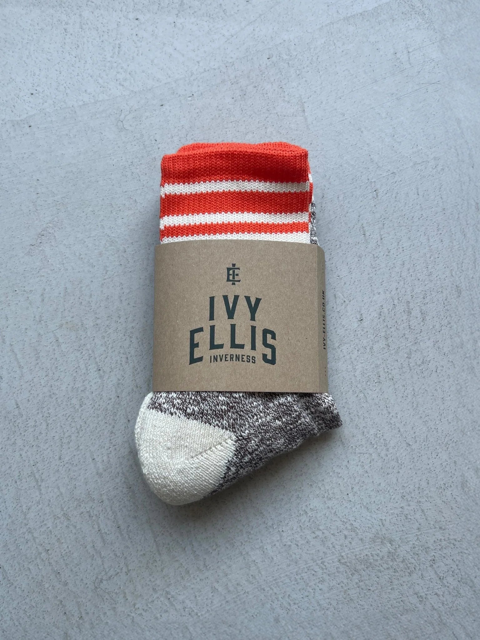 The Brora socks take inspiration from the Scottish coastline, crafted from ribbed tan slub yarn with a cream heel, toe, and orange-striped top. Textured, timeless, and unmistakably Ivy Ellis.