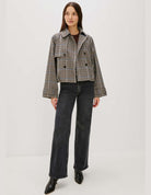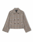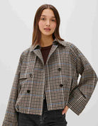 There's a chill in the air, and on the days when you need an extra layer of warmth, this jacket is just perfect. In a brown, black and blue checked print, this jacket is a casual staple, fit for throwing on with jeans and a casual tee or light knit. The bubble hem and customisable snaps add a striking shape and allows you to customise the fit.