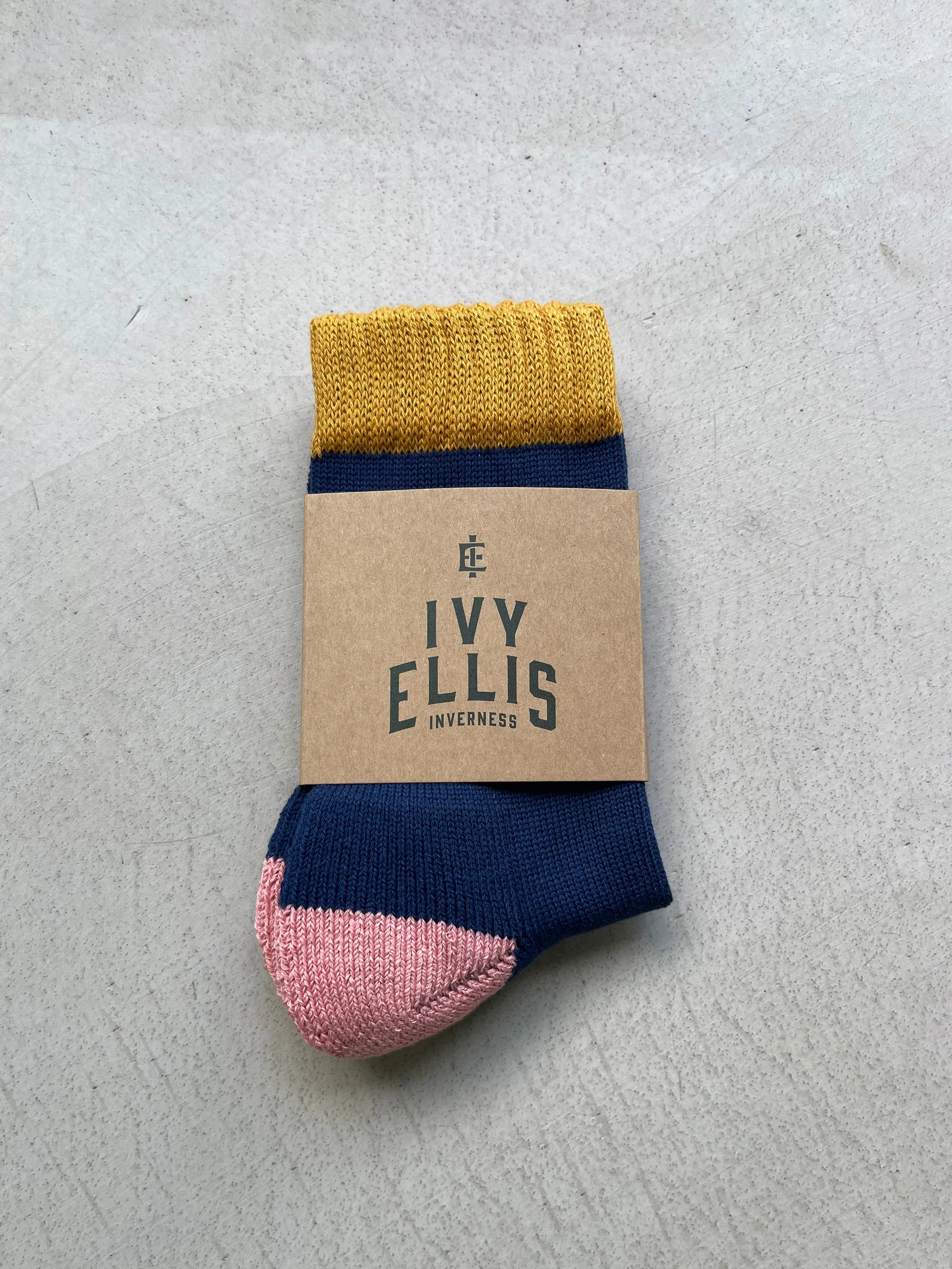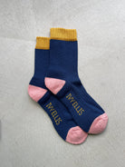 Lightweight and breathable, The Wallace socks combine navy ribbed yarn with a pink heel, pink toe, and mustard top. A signature Ivy Ellis blend of comfort, durability, and colour play.