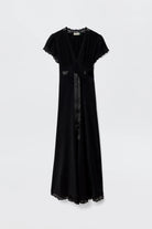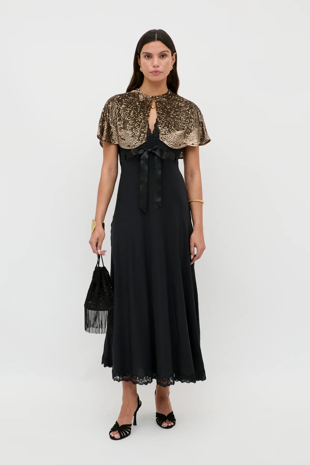 Ethereal and effortlessly elegant, this lightweight silk crepe de chine dress drapes beautifully across the body for a look that’s both timeless and romantic. Designed with a deep V-neckline and soft cap sleeves, it flatters the shoulders and décolletage with understated allure. The empire waist enhances the silhouette, flowing into an ankle-length skirt that moves gracefully with every step. A concealed zip fastening at the side ensures a seamless fit, keeping the focus on the dress’s fluid, feminine shape.