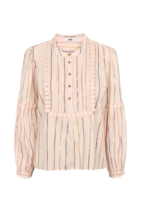 The picture of this blouse just doesn't do it justice! In the most beautiful peach toned pink colour, this light and airy blouse is an all year must have, we've fallen head over heels for it! The coloured stripes are complimented by a glittering gold that catches the light and makes you stand out for all the right reasons. We think linen trousers or a pair of light denim jeans lets this blouse truly shine.