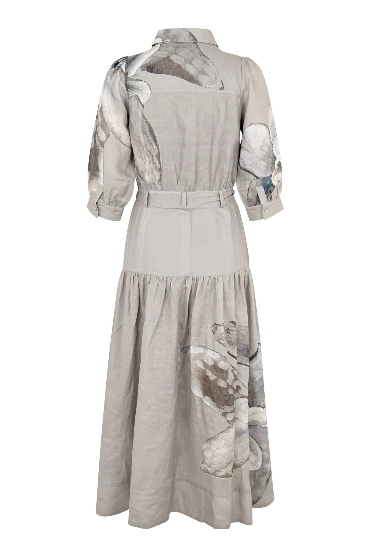 Beautiful oversized painted flowers in natural shades are scattered over this full length printed linen dress. A fitted top with neat shirt collar and half placket with 3/4 length sleeves opens into a wider skirt below a waist which is defined by a self fabric tie belt. The dress fastens by a zip at the side