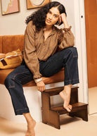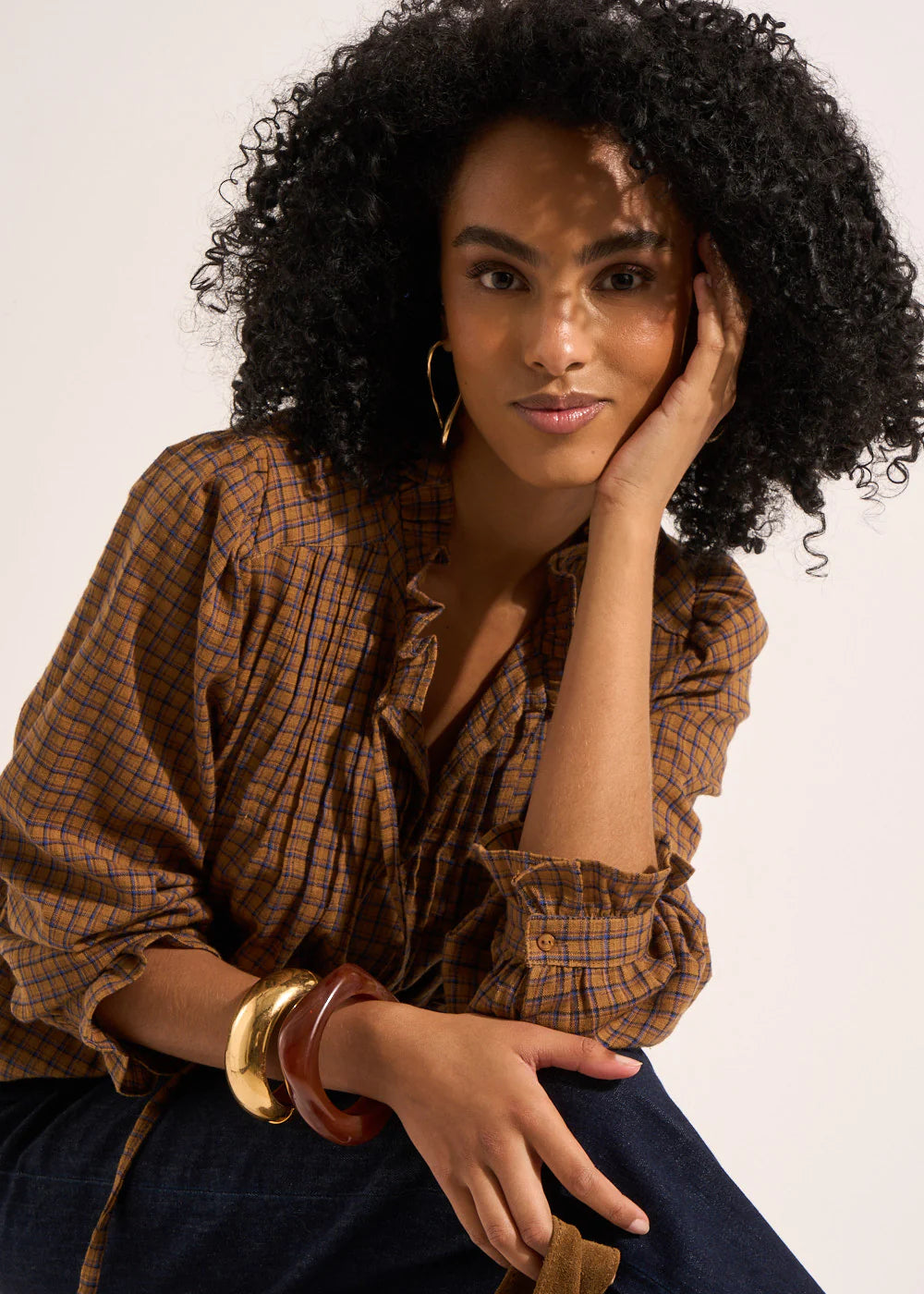 Bring classic checks to life with this flowing blouse that’s full of character. Cut in a relaxed, shirt-style silhouette, it features a ruffled stand-up collar with a tie and a Tunisian neckline for a touch of playful elegance. Pleated detailing at the front and a back yoke with gentle gathers add texture and movement, while long sleeves with soft gathers complete the look. Perfect tucked into high-waisted trousers for a smart-casual vibe, worn loose over jeans for effortless weekend style, or layered under a blazer for a chic, modern twist.