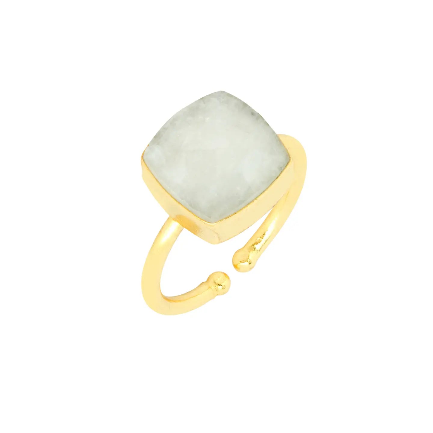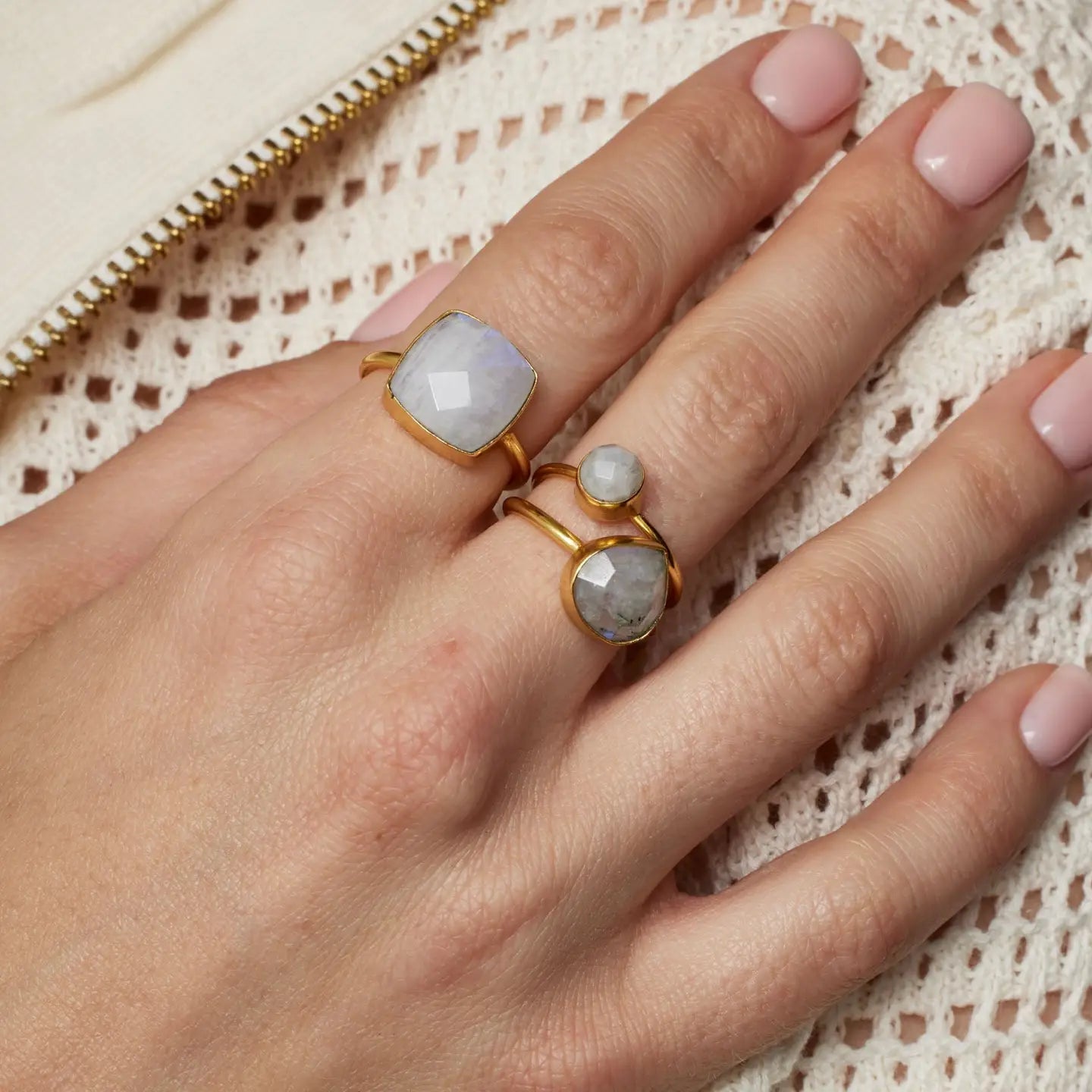 This ring is one of our best sellers thanks to its adjustable style and simple yet striking design. With a large square moonstone, this ring can easily be paired up with other gold bands, or worn alone for a minimal finish.
