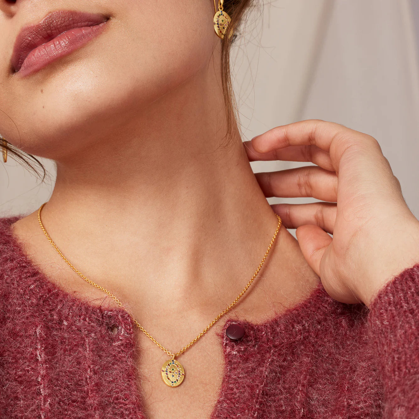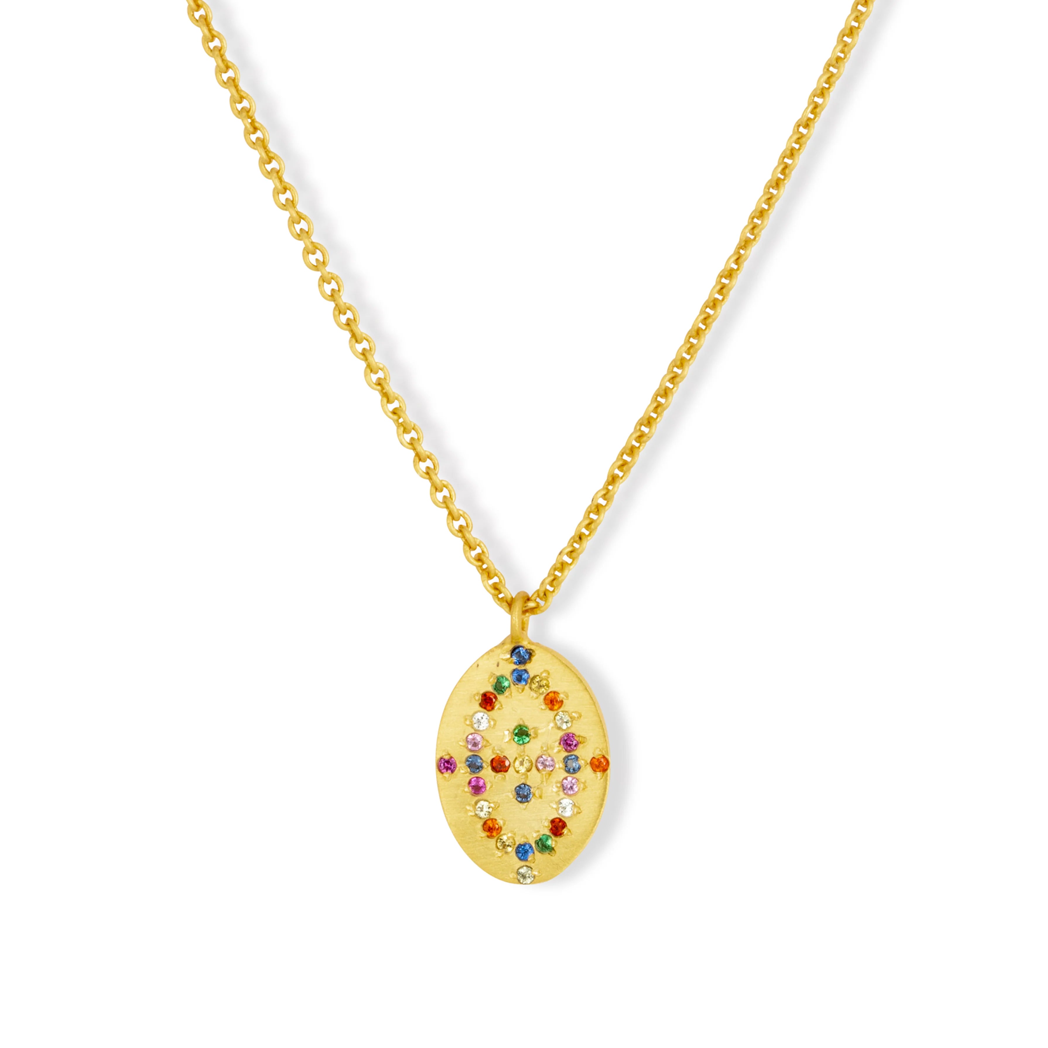This beautiful necklace features a simple gold coin charm with a rainbow of beautiful crystals in the center. On a dainty chain, this necklace looks beautiful layered up with other chains. We also have matching earrings avaliable.