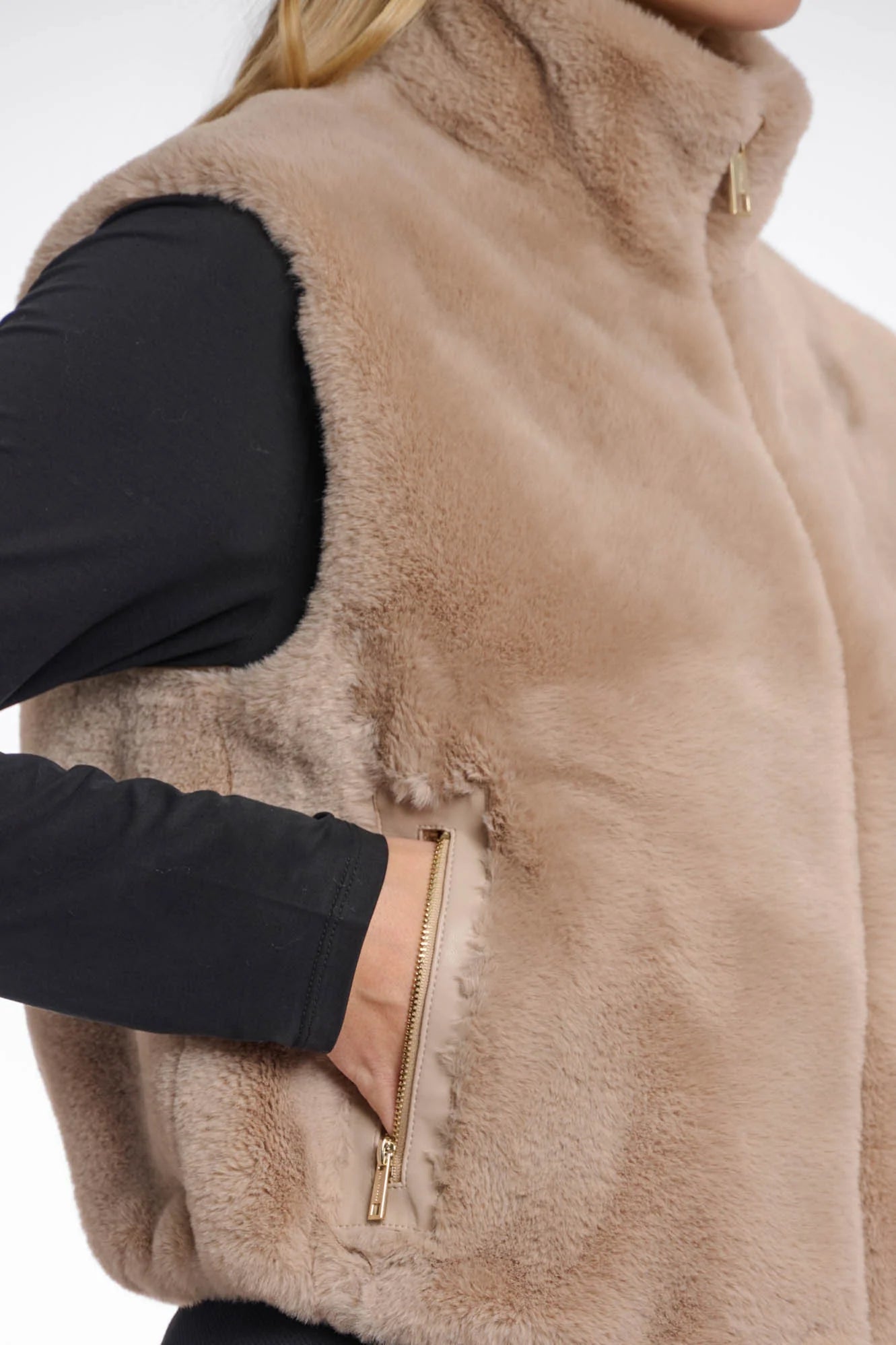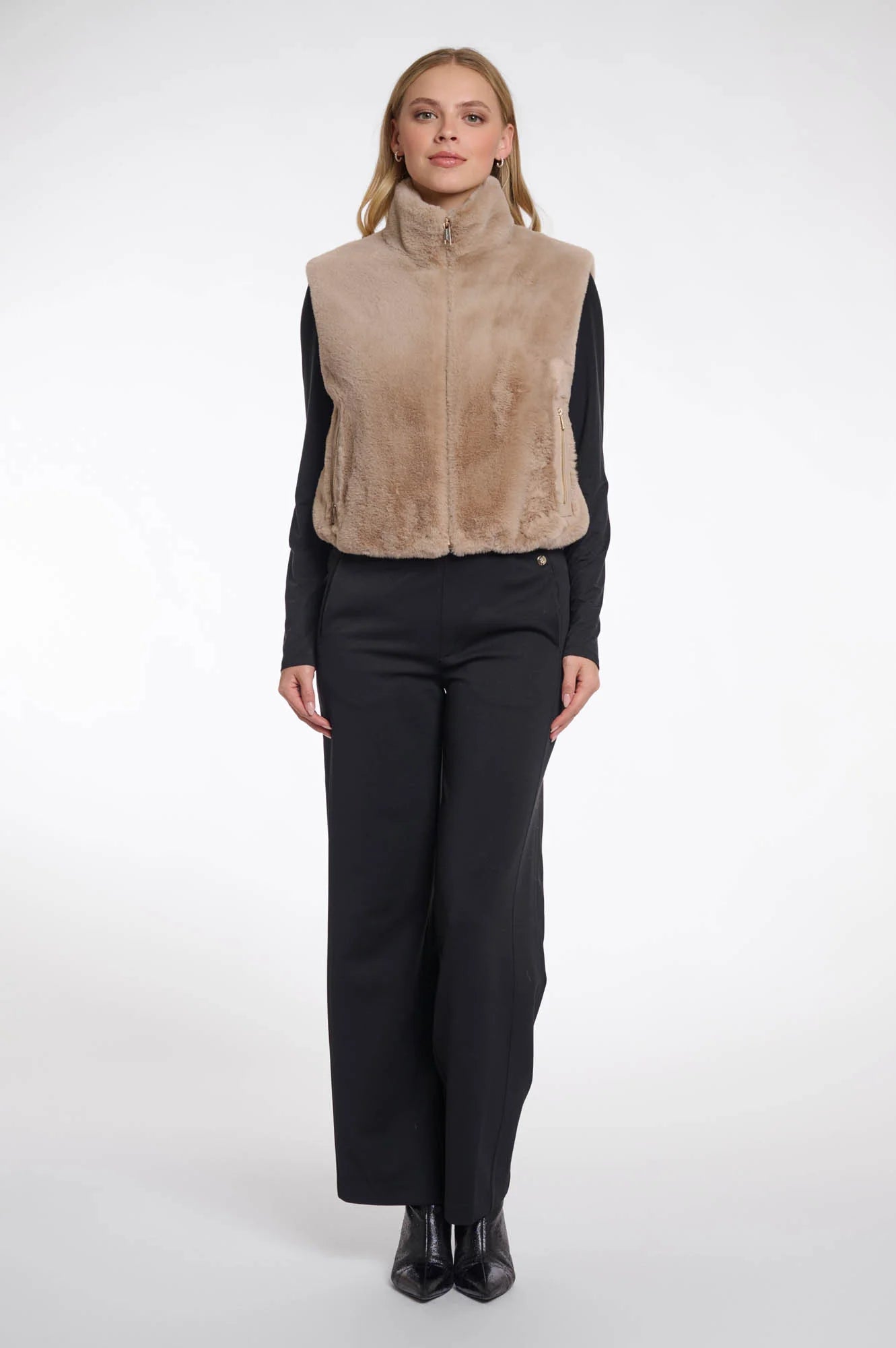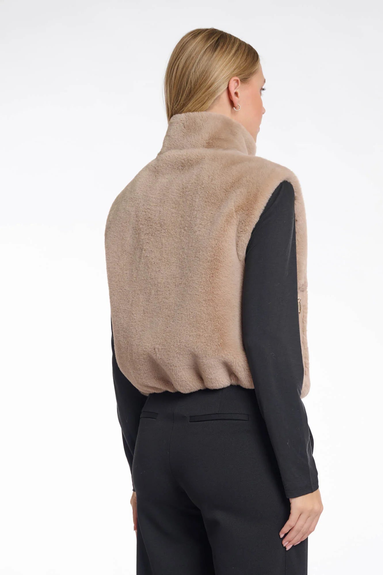 Fit for layering over t-shirts, knits and elegant blouses, this chic cropped waistcoat brings extra style and cosy warmth to your look. The faux fur is plush and snuggly, and the faux leather detailing only adds more luxury to your look.