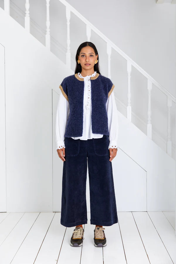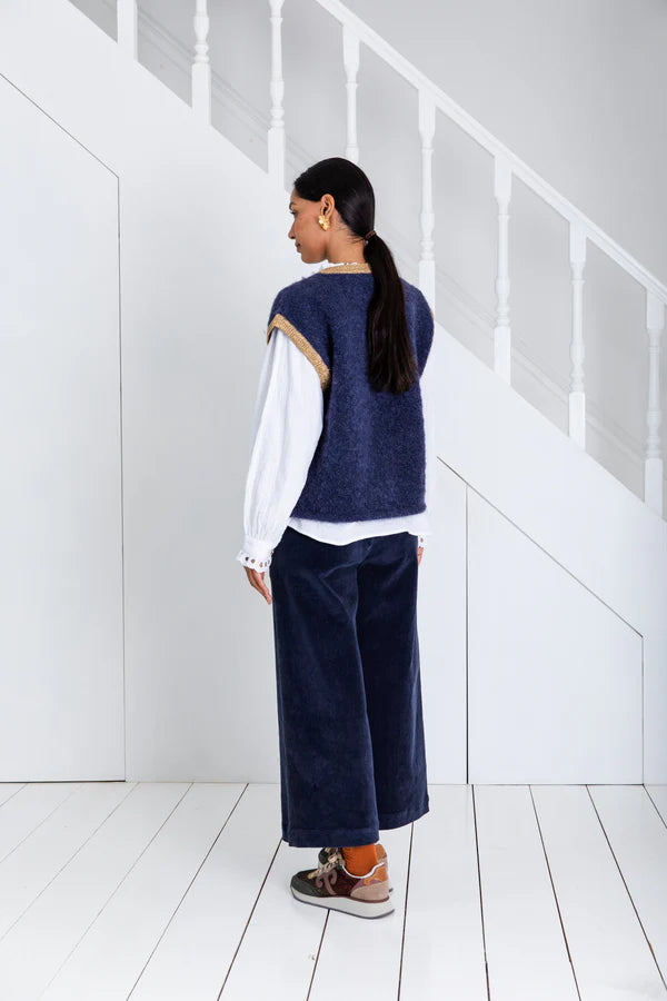 Fit for layering over knitwear, crisp button up blouses or a simple t-shirt, this vest is a must have for the winter. In a deep classic navy colour, this piece is timeless thanks to its simple design, but the gold lurex rib at the neck and cuffs keep this feeling really festive. The open finish makes layering this piece an easy way to jazz up your look.