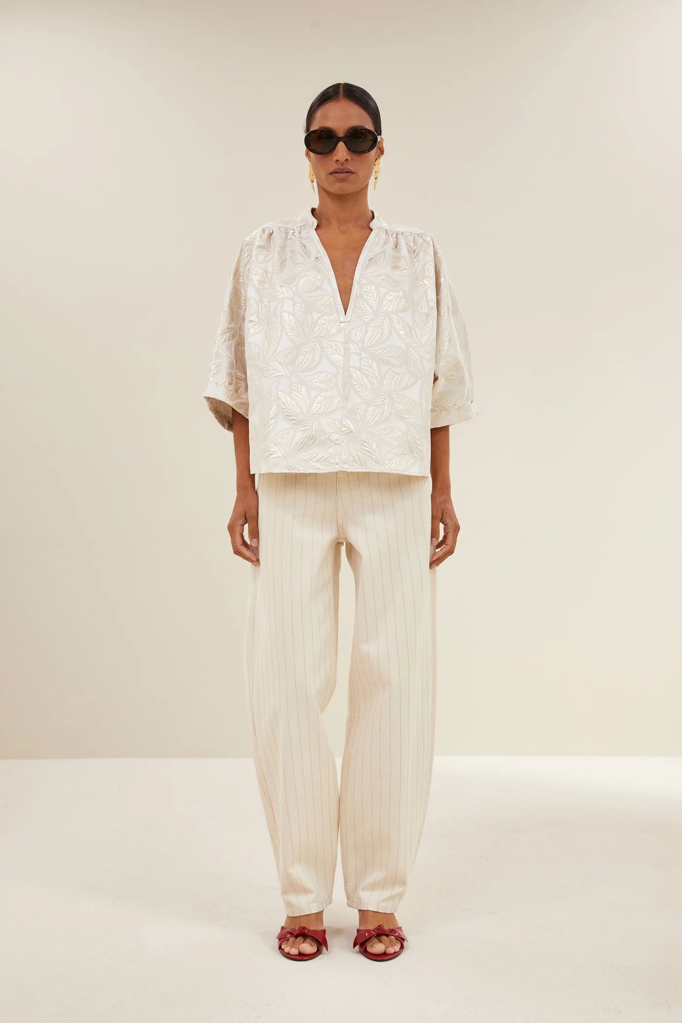 The levy jacquard blouse has a festive look thanks to the jacquard pattern and the elegant v-neckline. With a loose fit and 3/4 sleeves, this blouse offers a comfortable and stylish choice for any occasion. Perfect for adding a refined touch to your wardrobe!