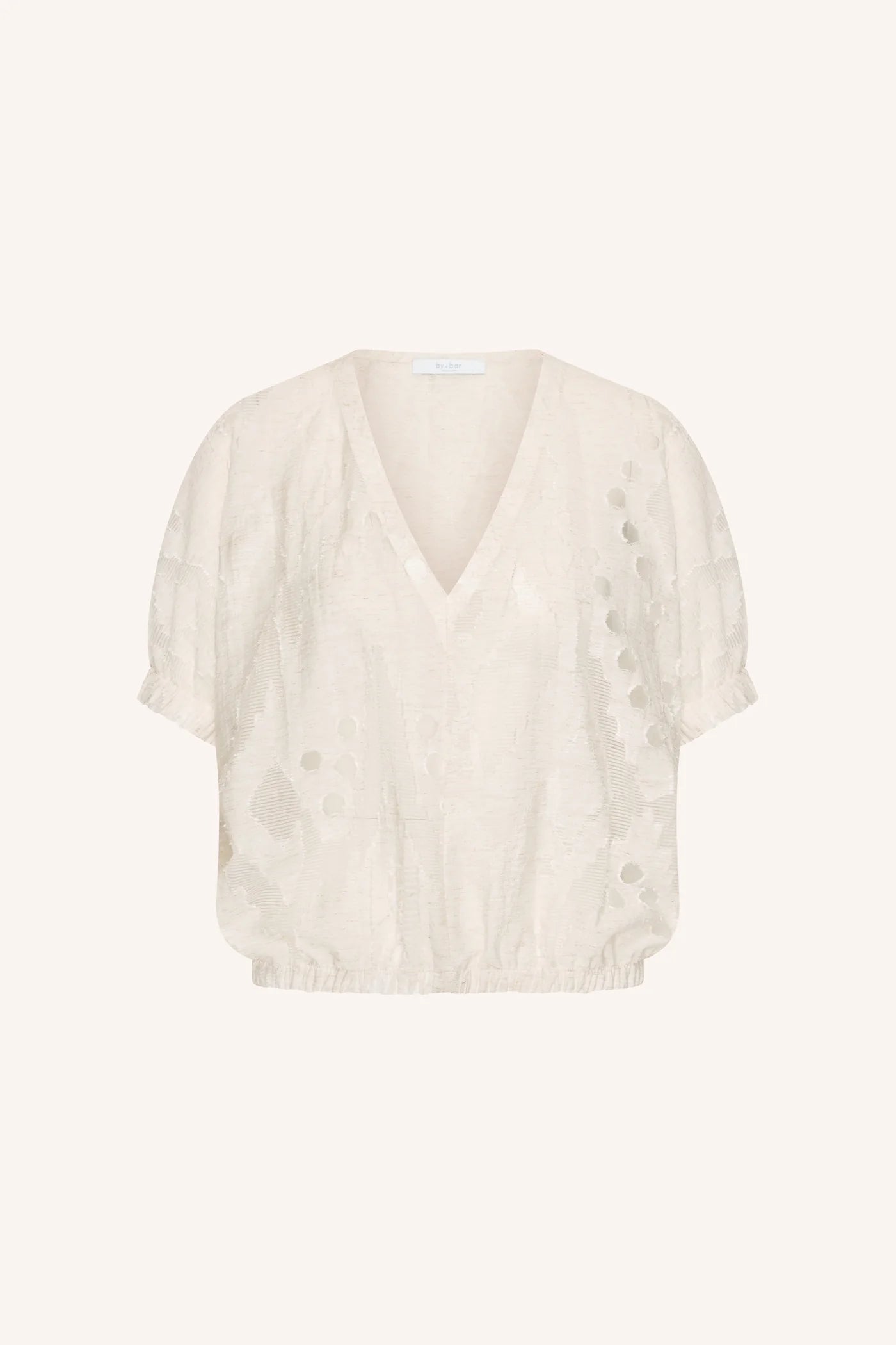 The mabel mist blouse combines a casual fit with a comfortable regular cut and a flattering v-neckline. Featuring elbow-length sleeves and subtle embroidery, this blouse is perfect for an effortless, stylish look that you can wear all day long. Thanks to the slightly tighter bottom, the blouse has a puffer effect and can be styled in various ways.