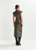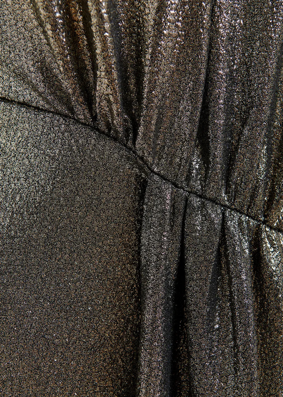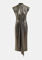 Get ready to turn heads in this lurex midi dress that sparkles with every move. The figure-hugging fit hugs your curves in all the right places, while the wrap-inspired skirt and box pleat gathering at the front add playful, flirty movement. Padded shoulders and a chic mock neck give it a touch of sophistication, and the hidden zipper keeps the finish sleek and seamless. Partially lined for comfort, this dress is your go-to for nights out, celebrations, or any occasion where you want to shine and have fun.