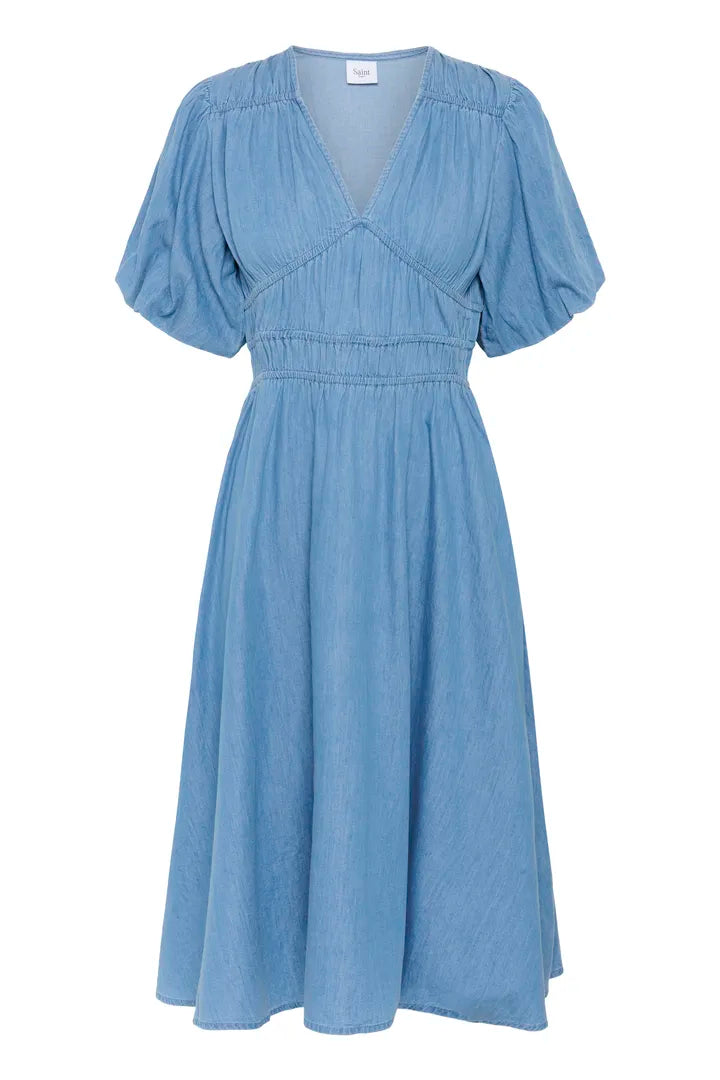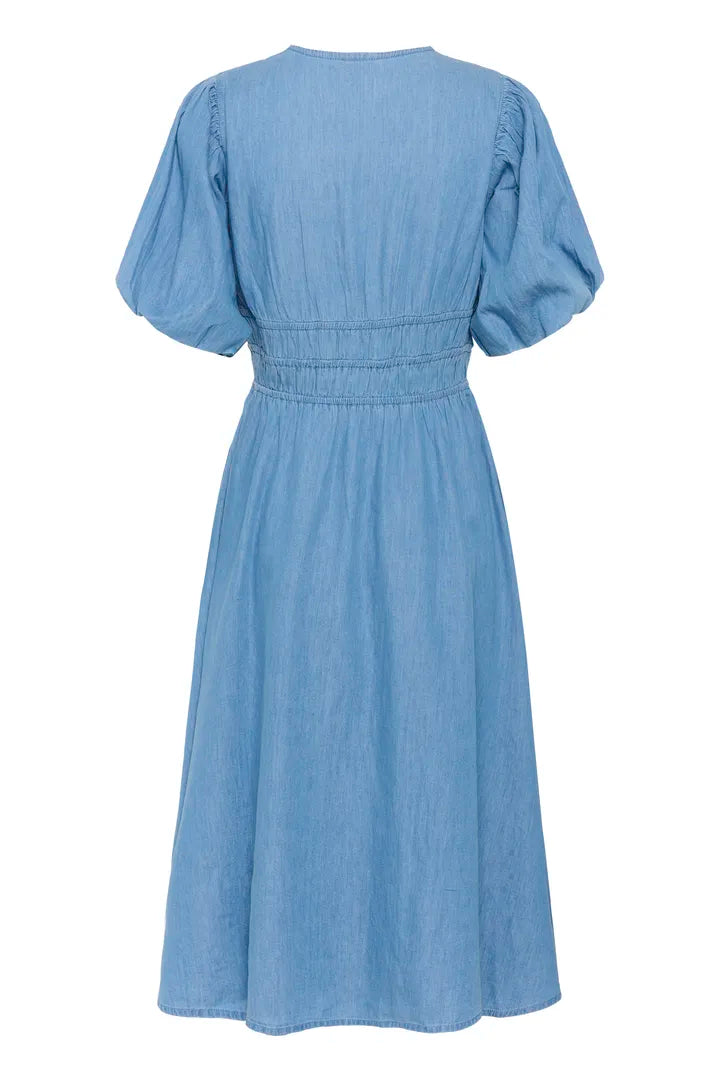 Casual with a twist of romance. This denim-effect dress features a flattering V-neckline and puffed sleeves, with seam detailing at the chest to accentuate the shape. The gathered waistband nips in for definition, flowing into a full A-line skirt in a flattering midaxi length.
