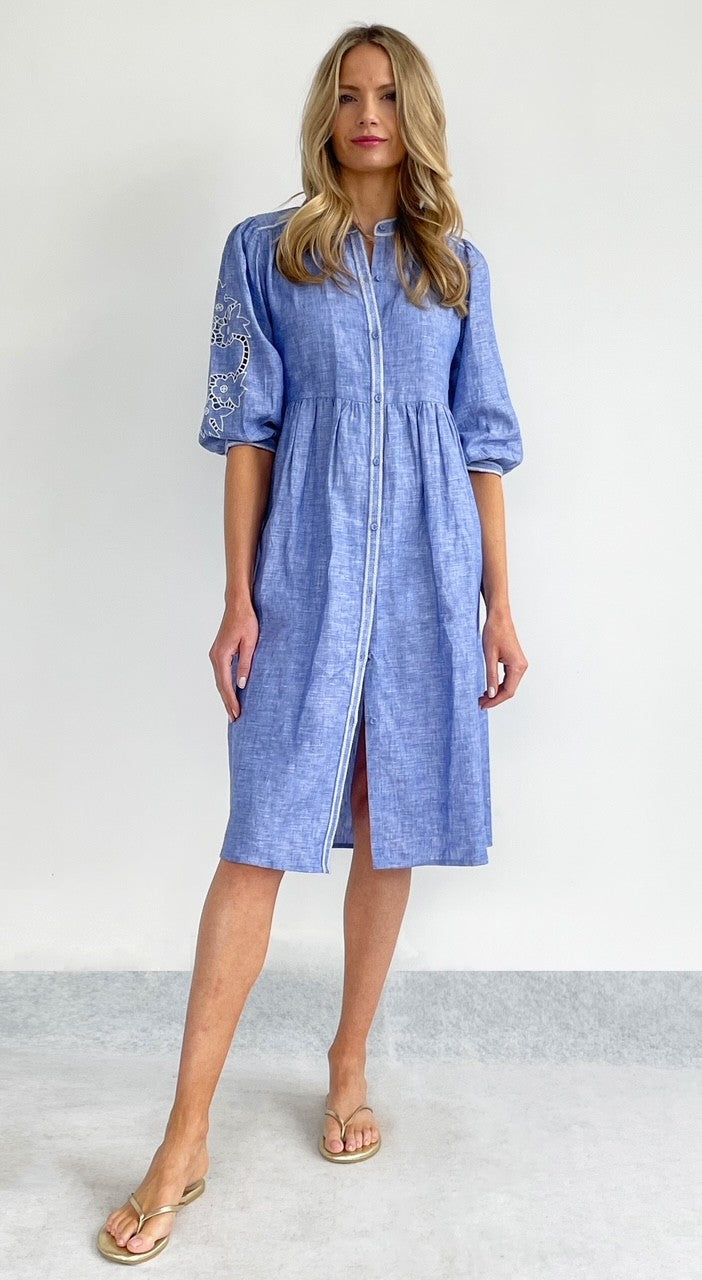 The warmest of summer days need a breathable and lightweight outfit, and this dress is just that. With a beautiful shirt-dress style, this design has a button up front and flattering gathered waist, the blouson sleeves are decorated with ladder lace and embroidery for a unique, but timeless look.