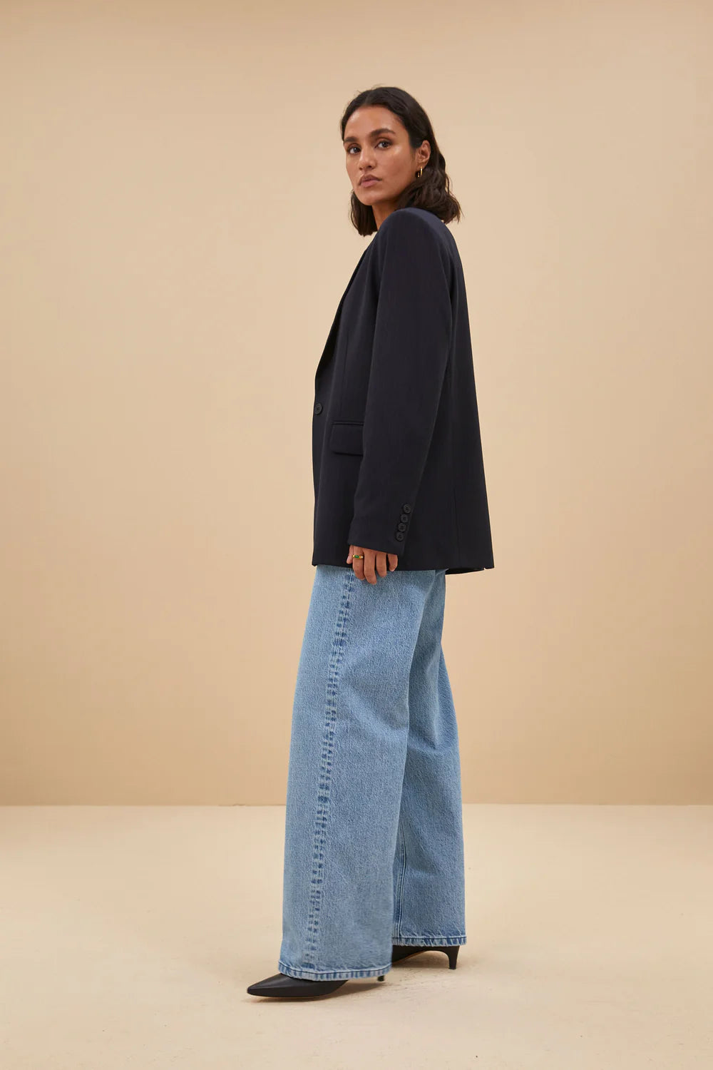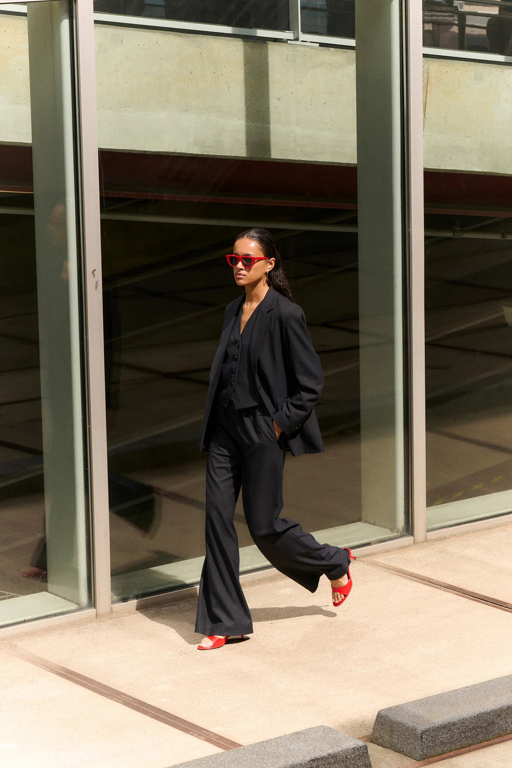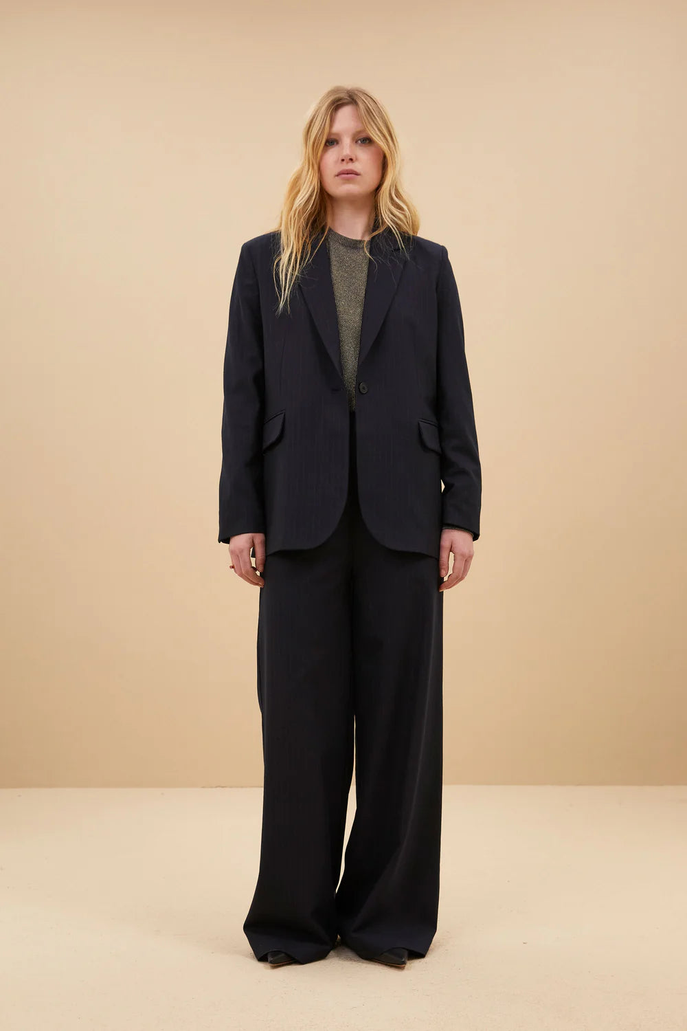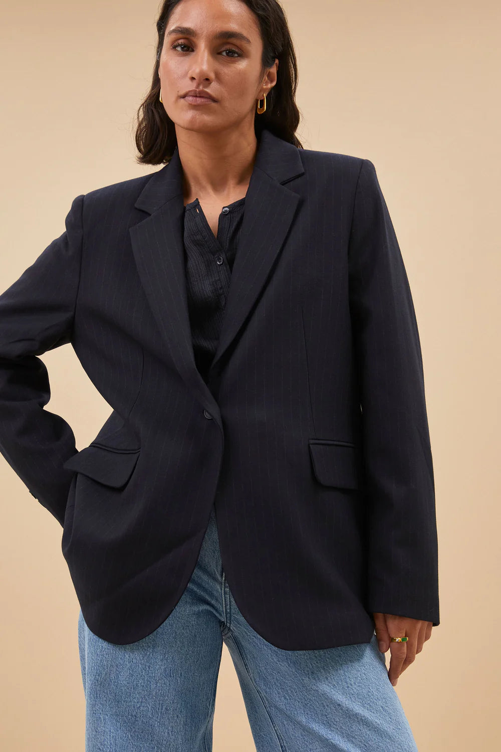 This timeless pinstriped blazer is a classic piece, perfect for a sophisticated wardrobe. In a single-breasted design with a slightly oversized fit, this blazer can be layered up over blouses, t-shirts and fine knits for a smart casual look. Pair with the matching trousers and waistcoat to complete this three piece suit.