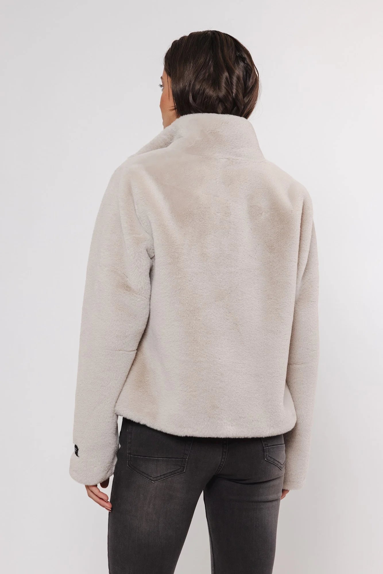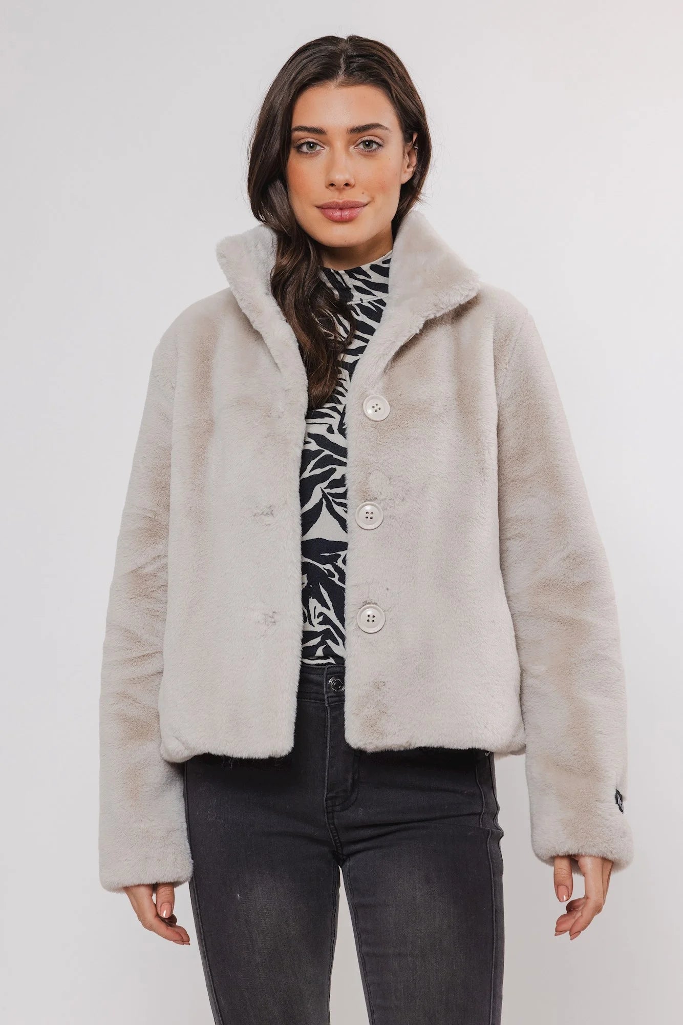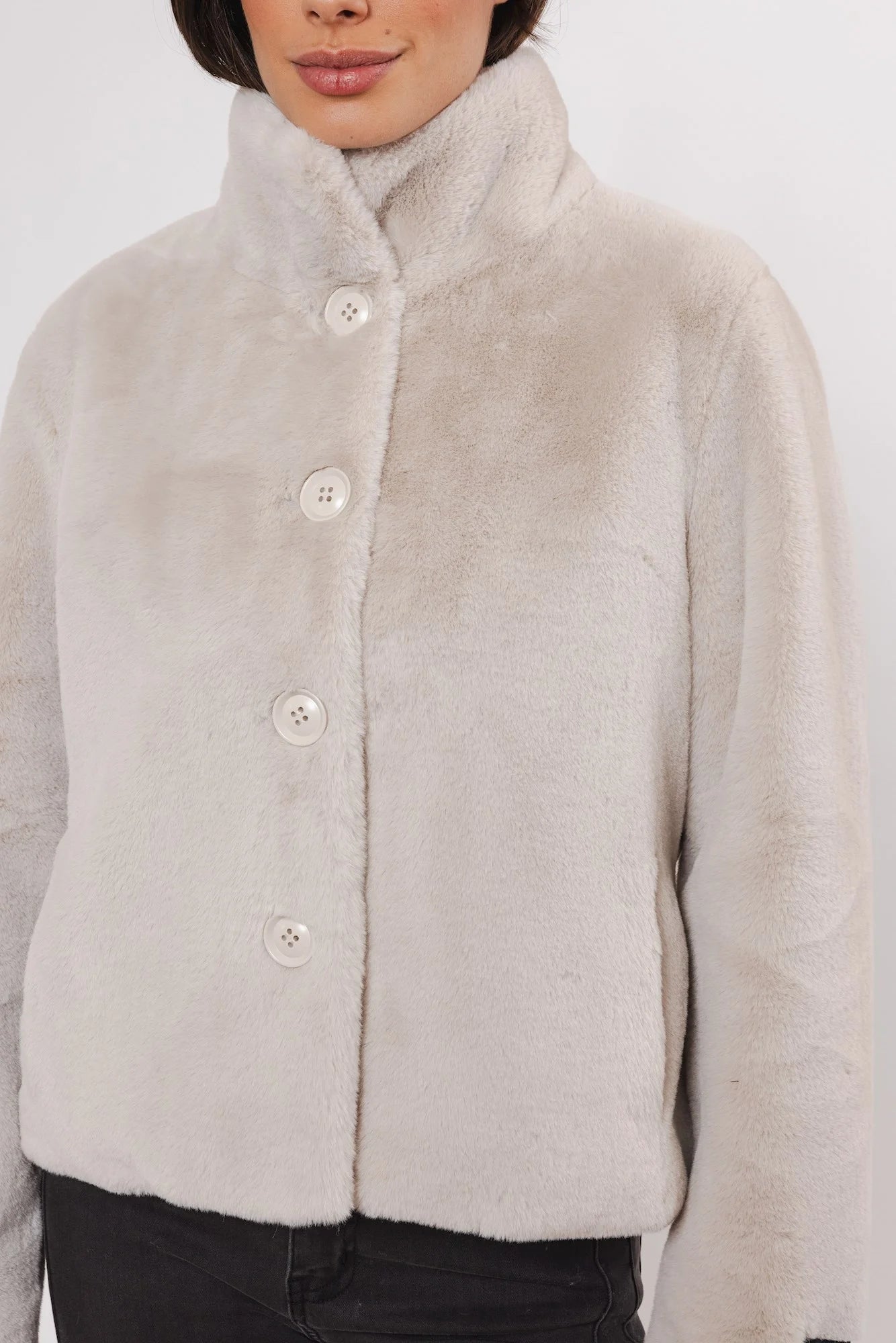 A short faux fur jacket transforms a simple outfit with its classic shape. In a luxurious soft feel, this jacket keeps you just as warm as stylish. The high neck collar, simple button-up design, and pockets for practicality give this jacket a traditional shape, making it easy to style with almost anything.