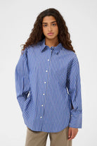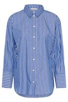 Classic stripes, but make them oversized. This shirt is tailored with a sharp collar, button-down front, and neat cuffs, yet the roomy fit keeps it relaxed and effortless. Long sleeves and a crisp striped pattern give it that timeless, borrowed-from-him vibe with a playful twist.