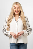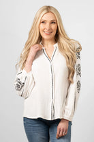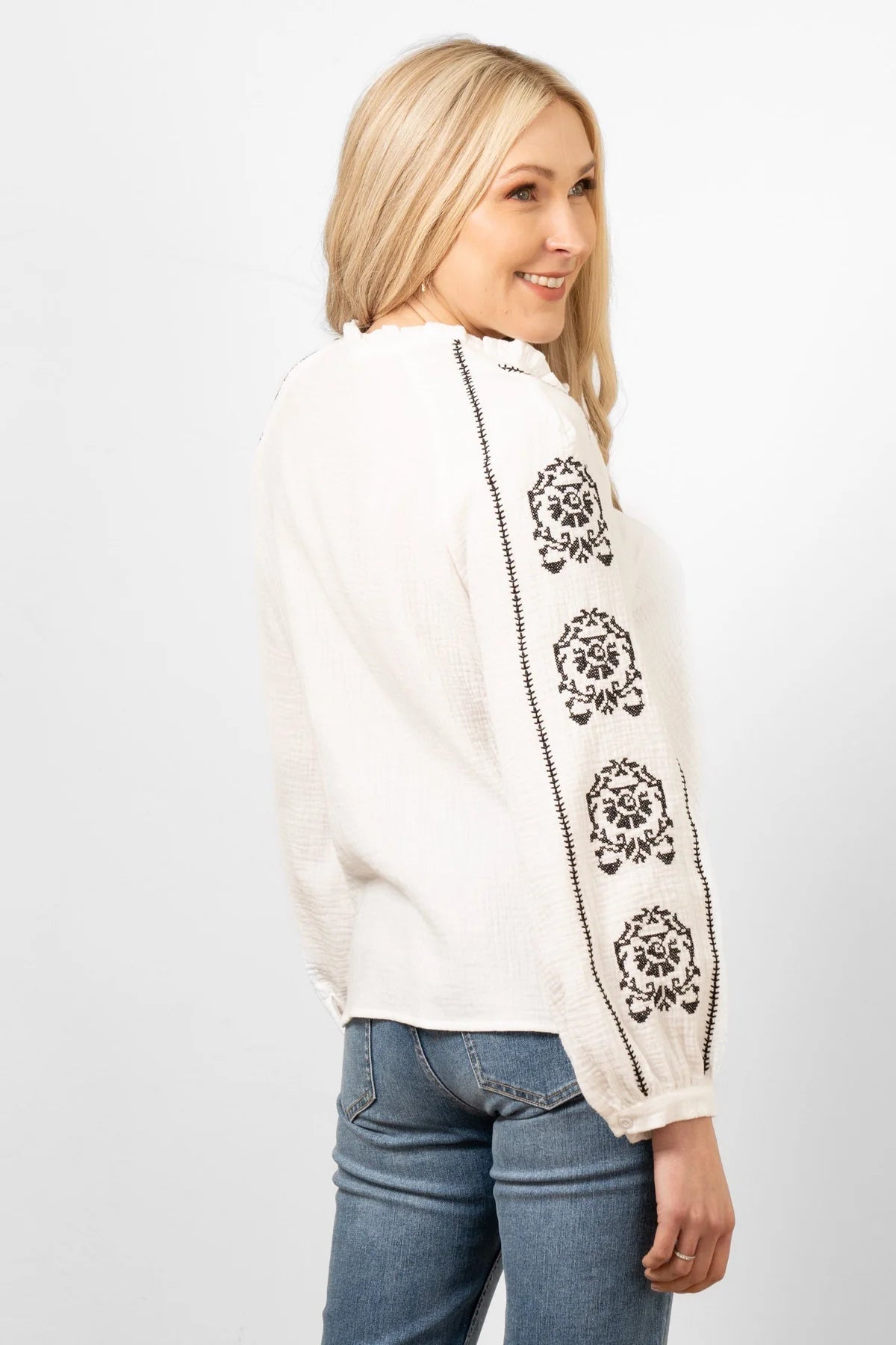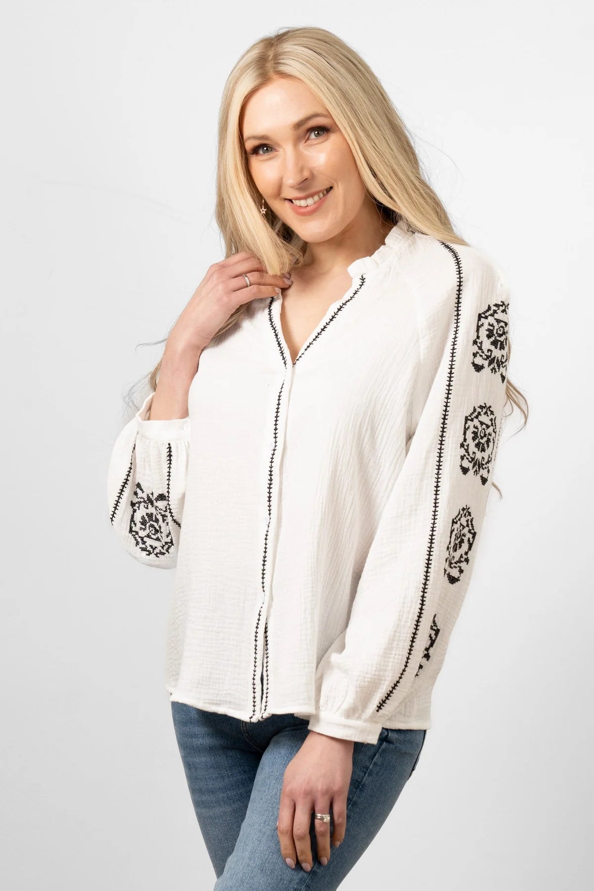 This beautiful shirt is made from a lightweight cotton, making it an ideal piece for the summer. Inspired by bohemian designs, this shirt has been decorated with beautiful embroidery over the sleeves, to add some extra styling.