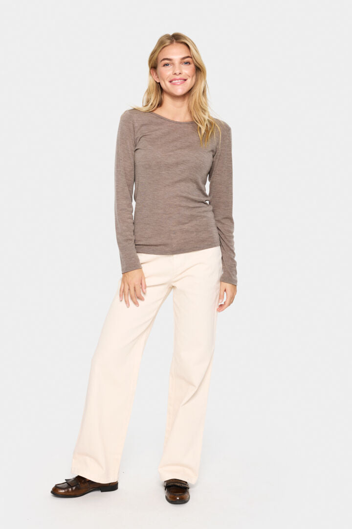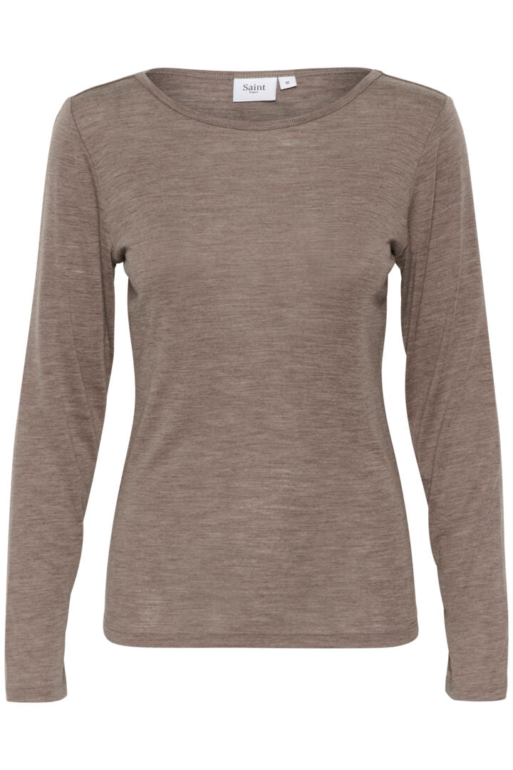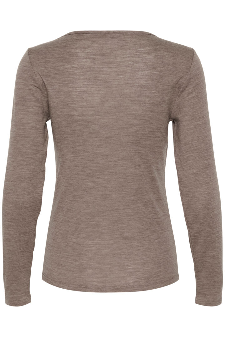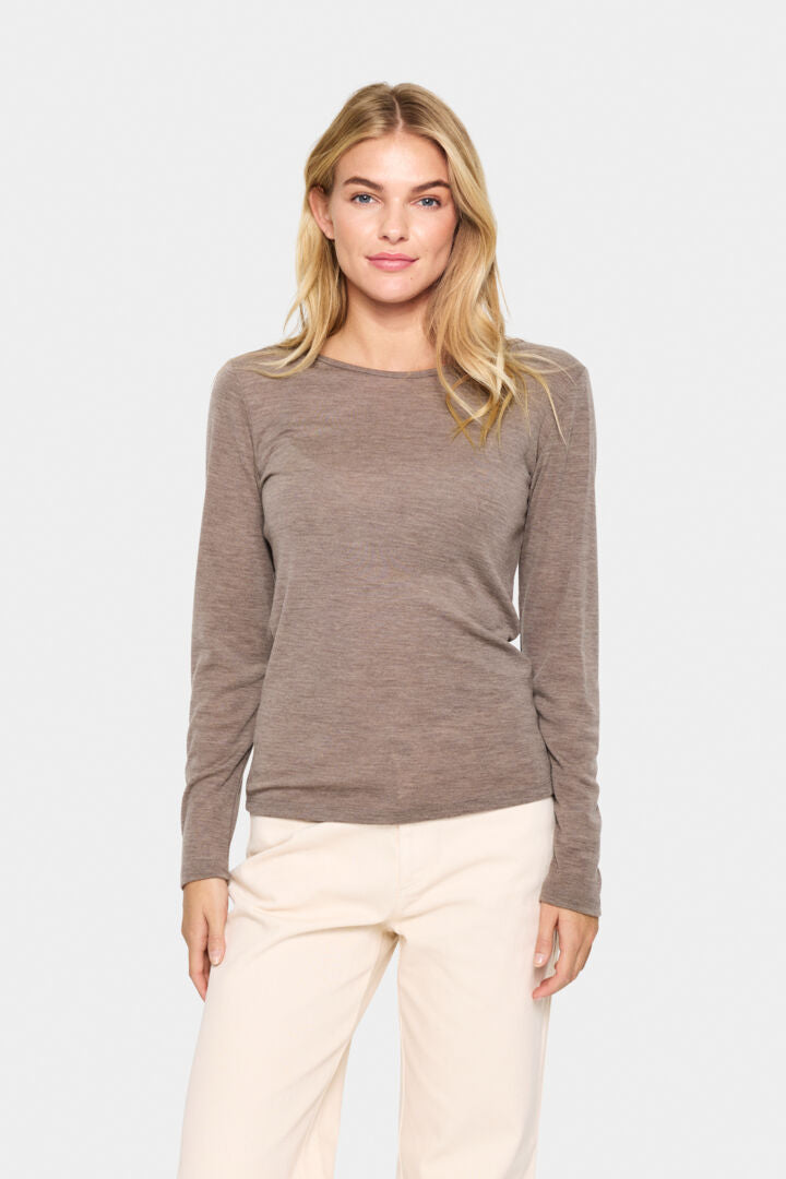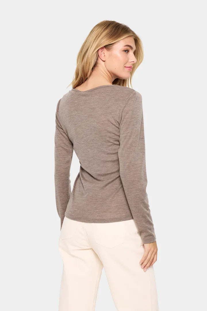 This long sleeved top is the ultimate capsule wardrobe piece thanks to its simple round neckline and slim fit cut. In a brown/khaki colour this top is perfect for layering under a faux fur gilet and pairing with dark indigo jeans.