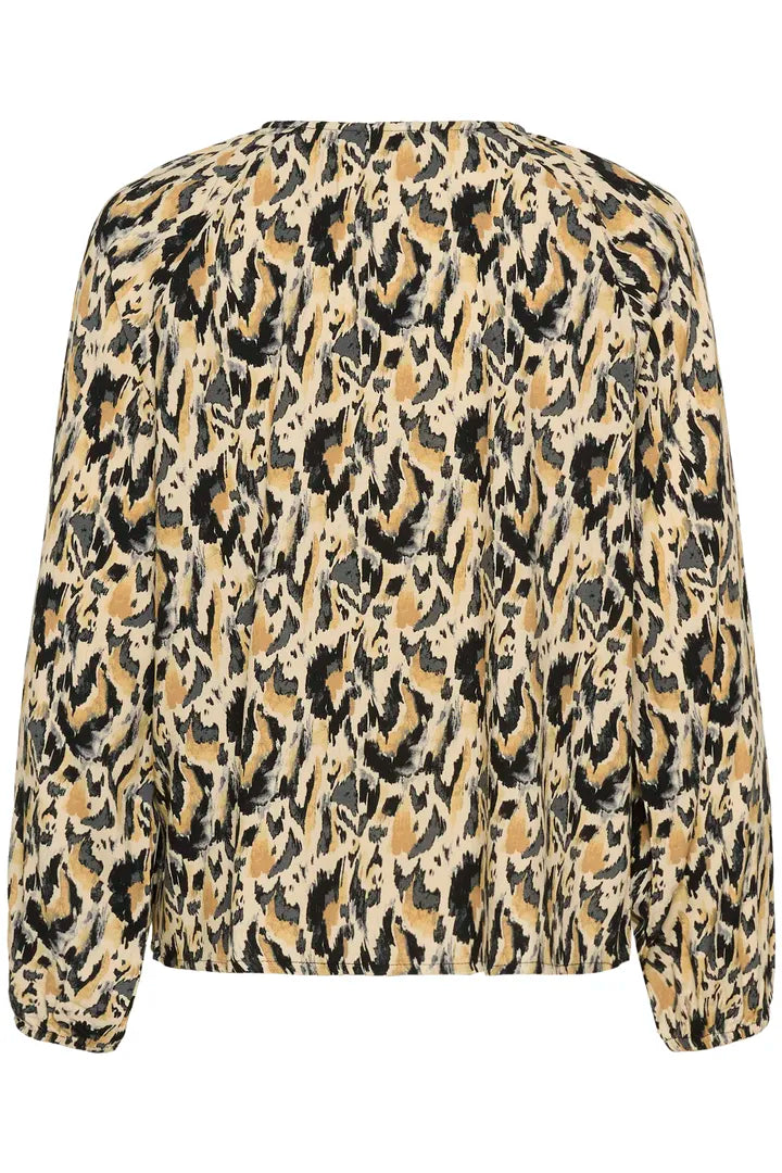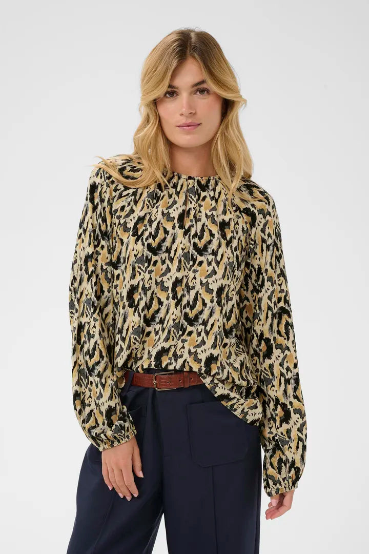 Pretty with a hint of drama. This blouse features long sleeves with a subtle puffed effect, a high rounded neckline, and a single button at the chest for delicate detailing. The all-over printed design adds a playful, feminine touch.