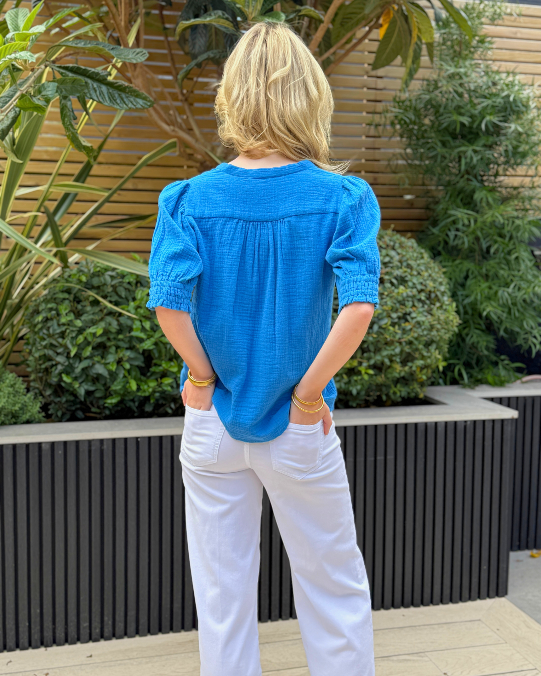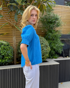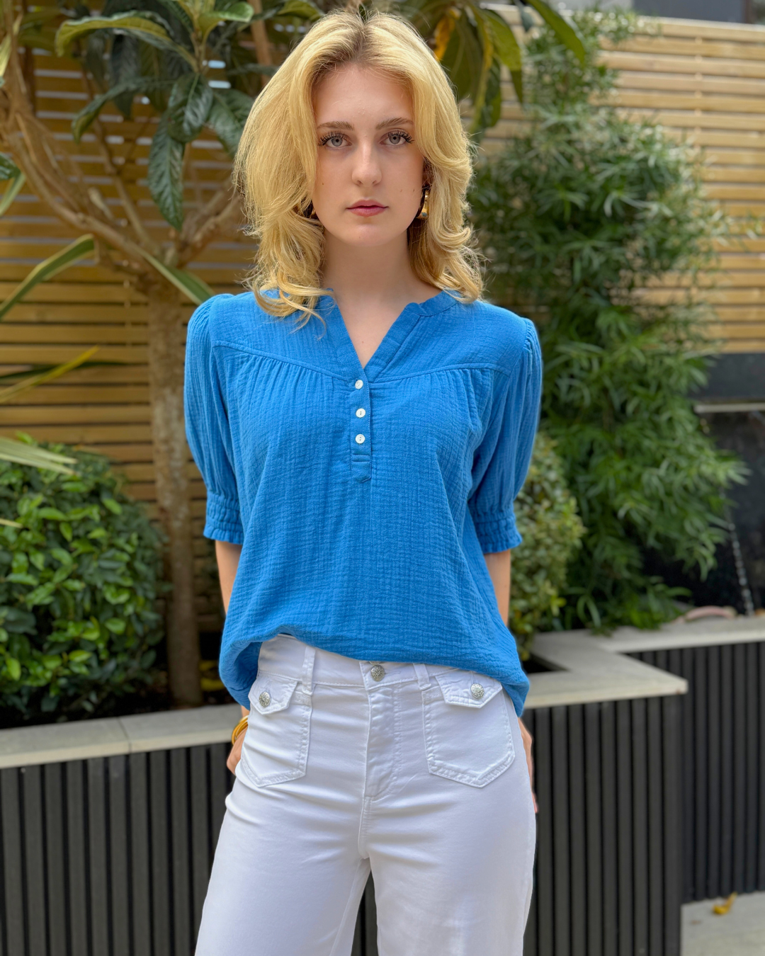 This beautiful shirt is made of summery cheesecloth cotton and gives any outfit that playful feminine touch without the effort. The short sleeves have a gentle puffed effect to them, to create shape and movement in any outfit. We think classic denim really helps this colour to pop!