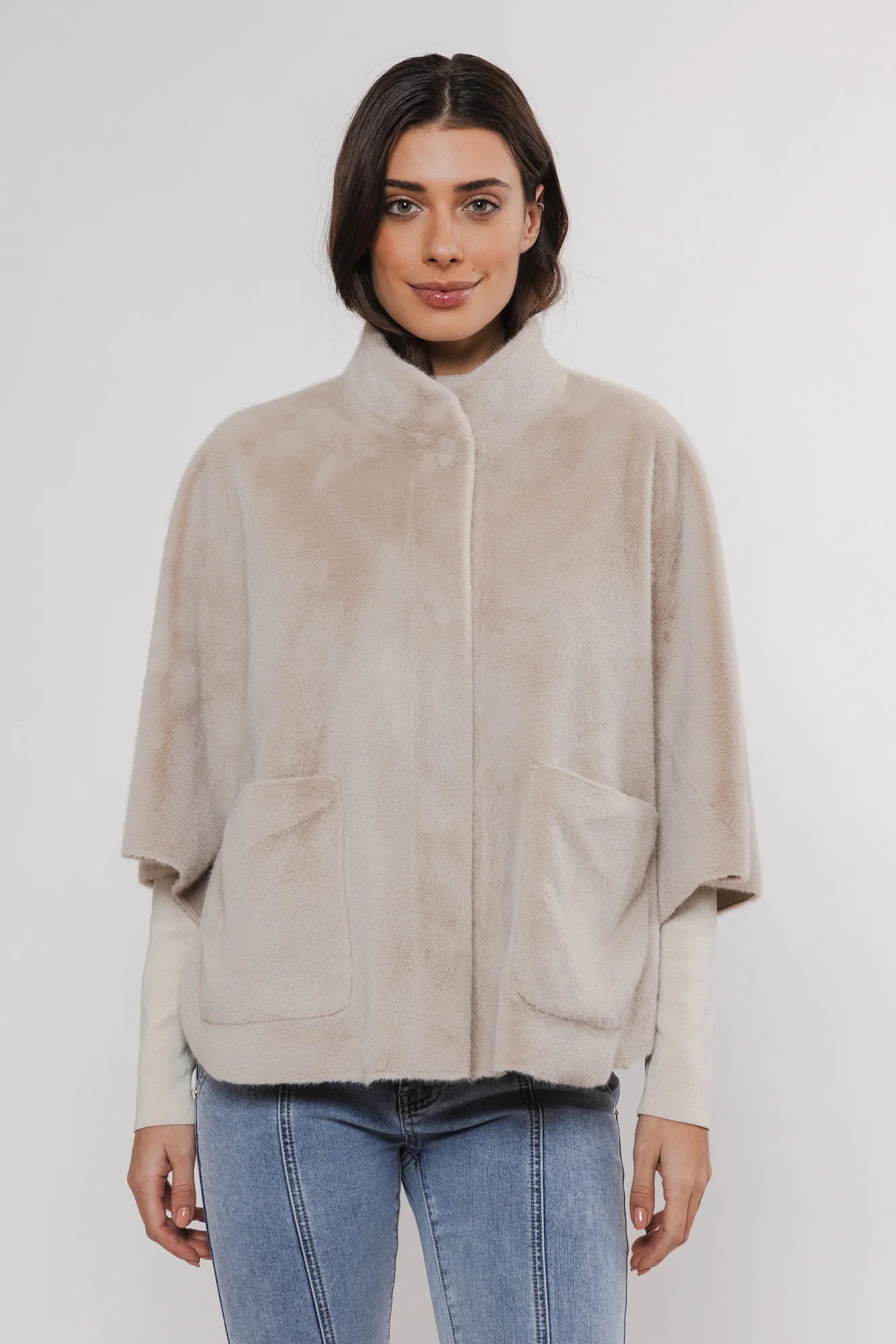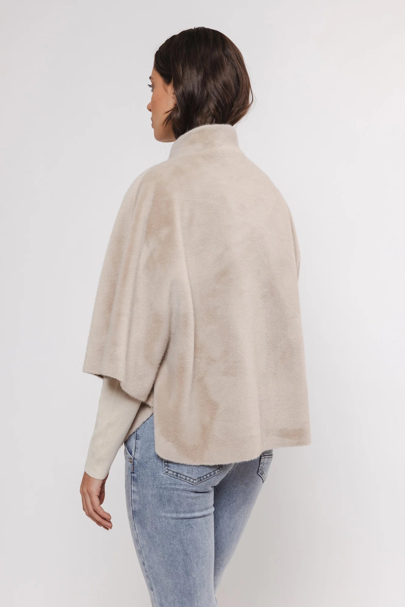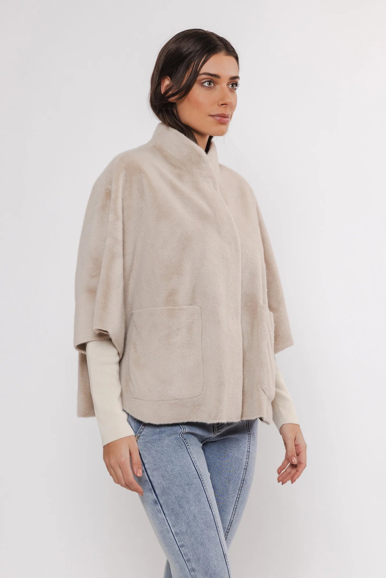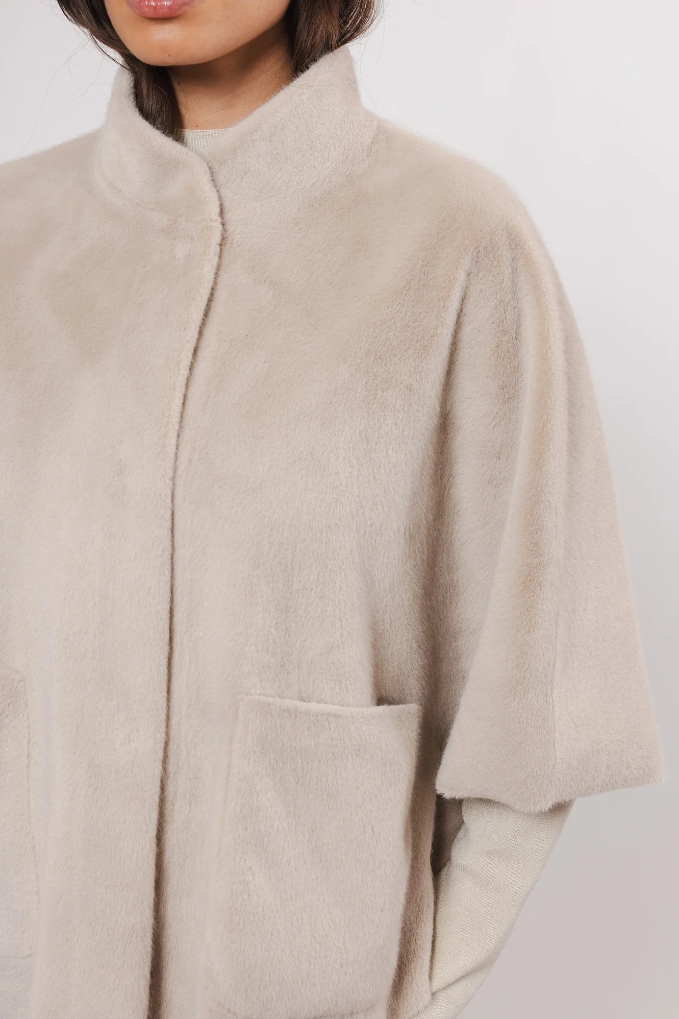 Indulge in luxury with our Dewi Cape in Birch. Made with elegant faux fur, this chic and fashionable piece features open pockets and a snap button closure for added class. Its soft fabric and short sleeves, along with slit details for easy movement, make this cape a must-have for any stylish wardrobe.