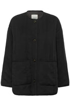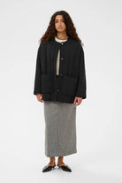 Utility with a feminine twist. This washed black top features long sleeves, a round neckline, and a soft puffed effect for subtle volume. Large patch pockets at the front add a playful, practical edge, while the button closure keeps it effortlessly easy.