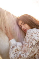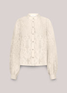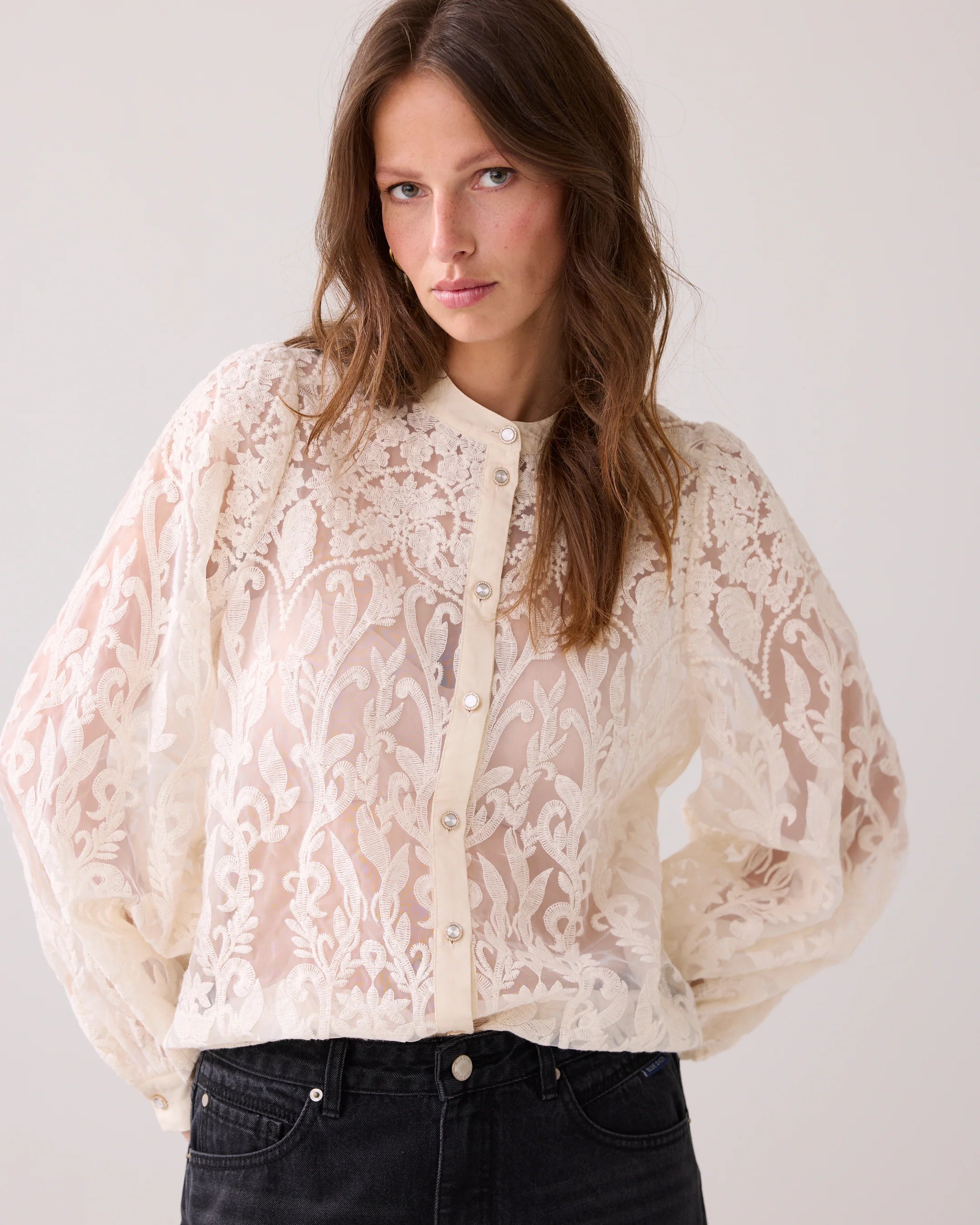 Delicate, dreamy, and a little bit flirtatious. This blouse features a sheer, fine lace fabric with a rounded neckline and pearl-button fastening that feels effortlessly elegant. Puffed sleeves with cuffs add romantic volume, making it a piece that’s as playful as it is polished.