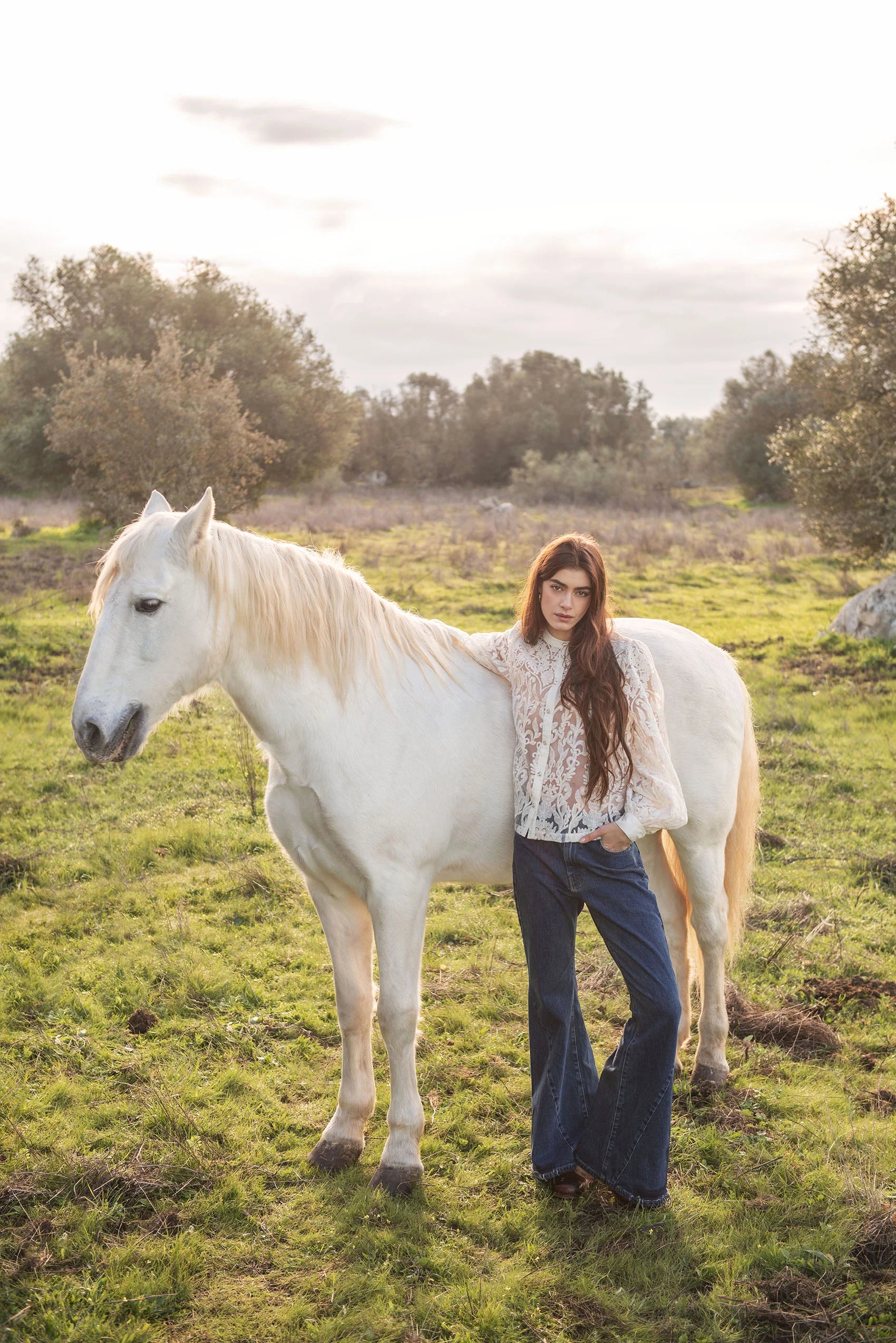 Pair it with high-waisted trousers for refined elegance, or layer over a cami with jeans for a touch of everyday glamour. It’s the kind of blouse that turns even the simplest outfit into something special.