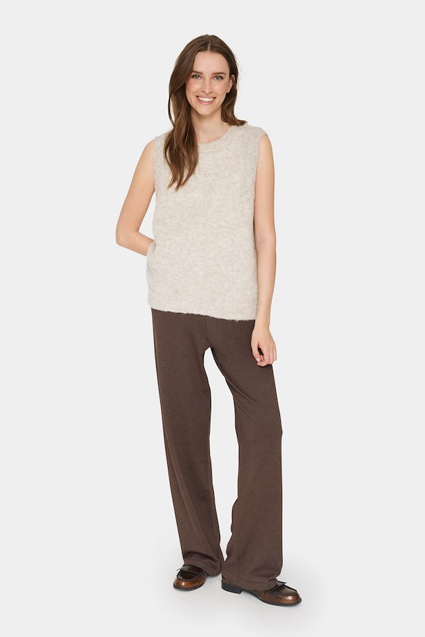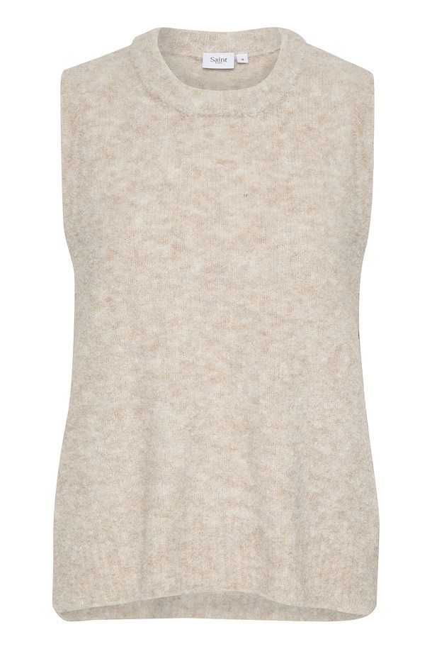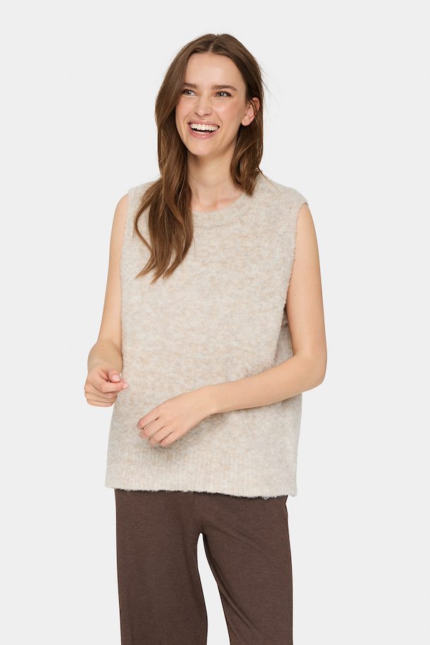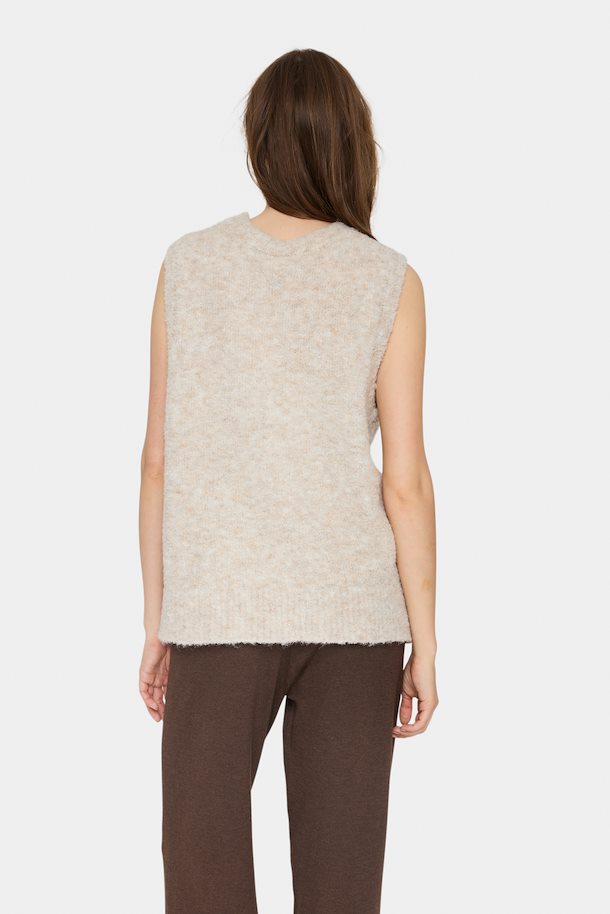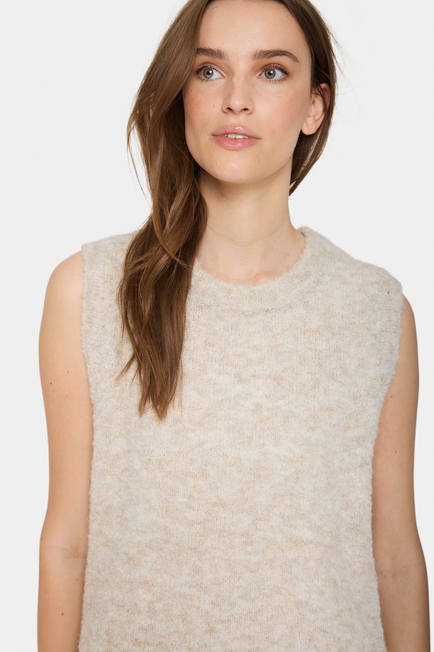 This sleeveless knit is the perfect layering companion for the winter months. In a warm beige toned grey, this knit looks beautiful over a white american vintage t-shirt, paired with indigo jeans.