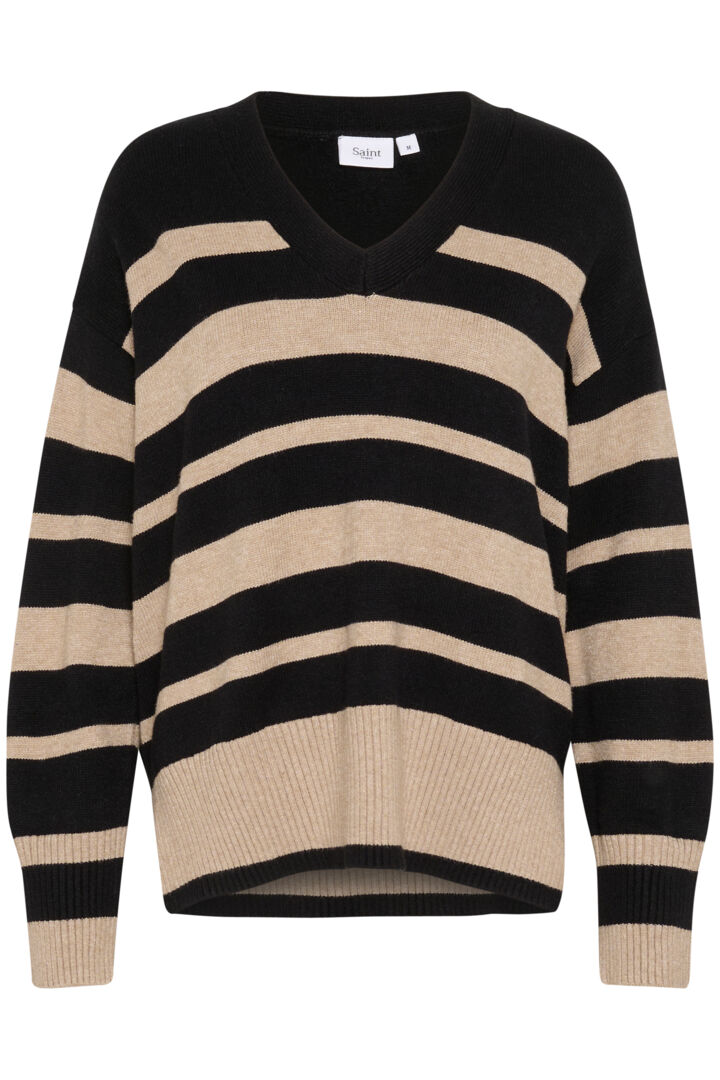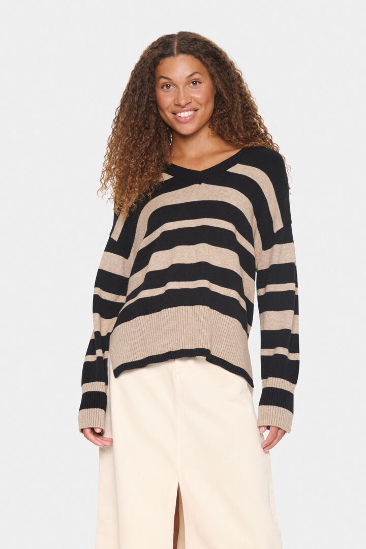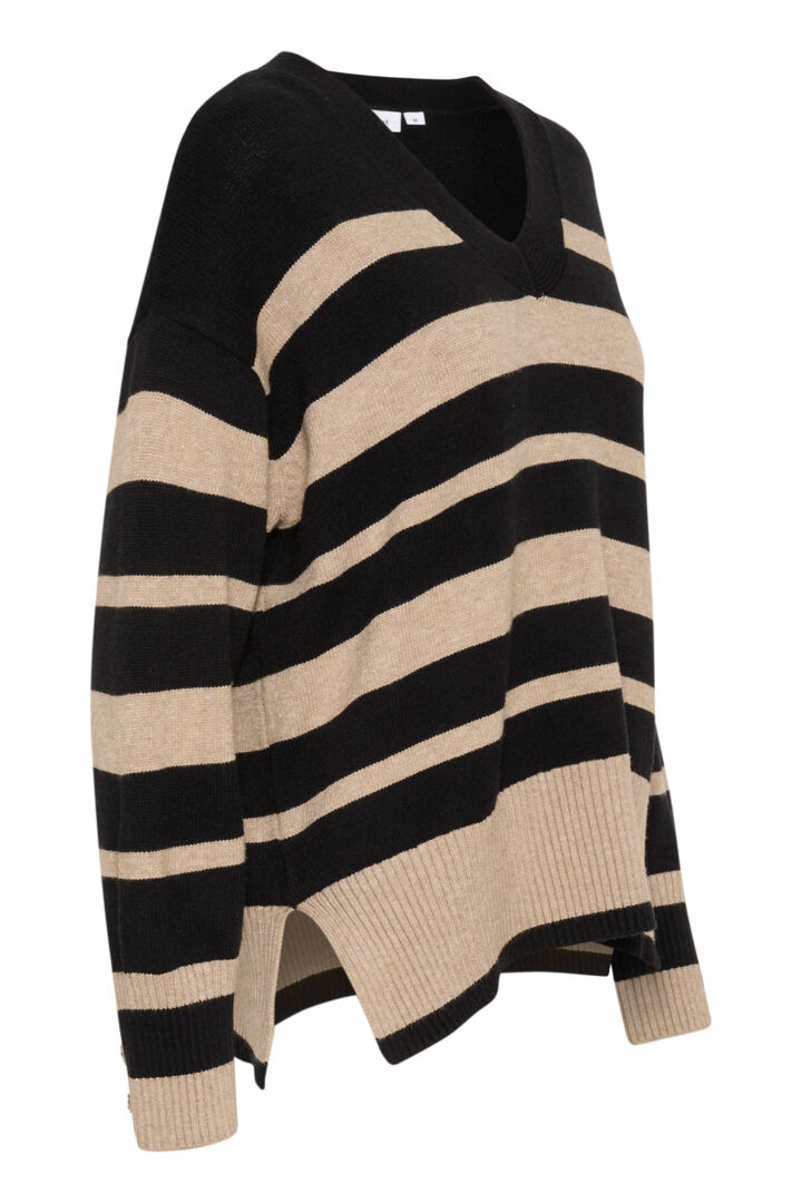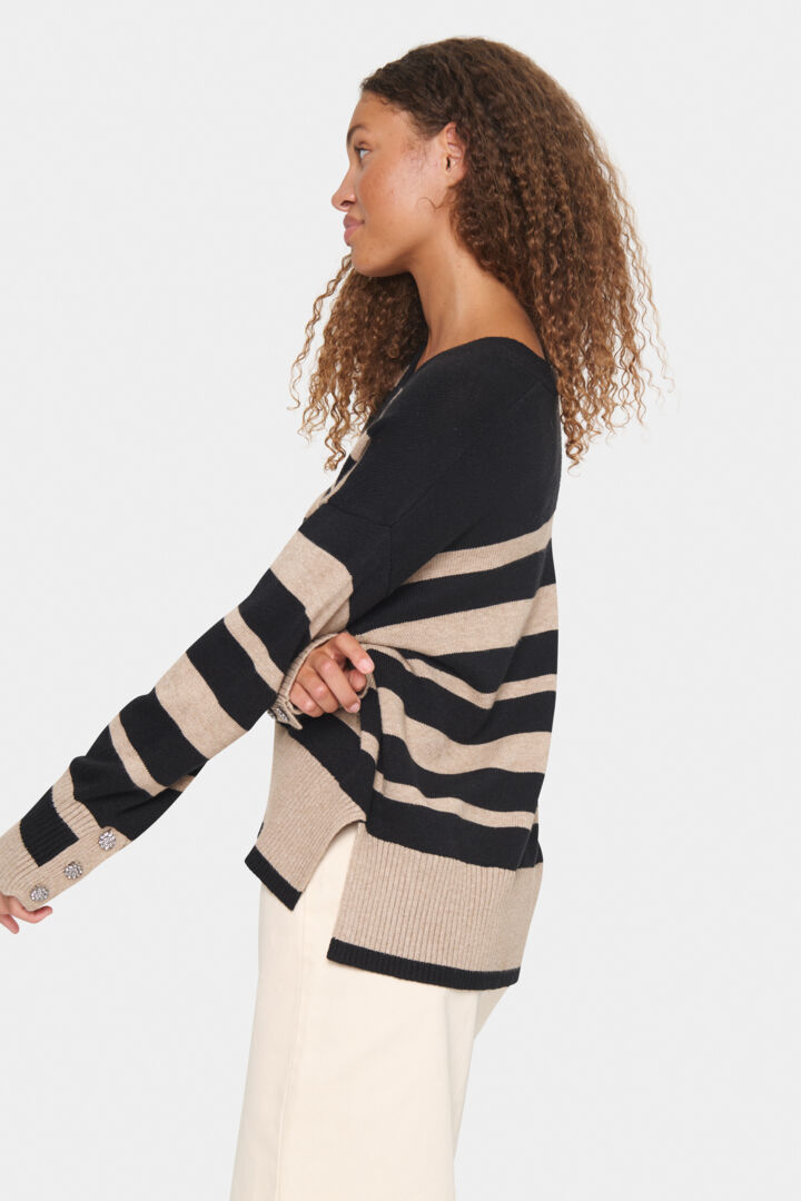 This striped sweater is a classic piece, but with a feminine twist! In a loose fit style with a casual v-neckline, this sweater is great for everyday wear. The detailed buttons on the sleeves add some extra sparkle to your outfit.