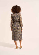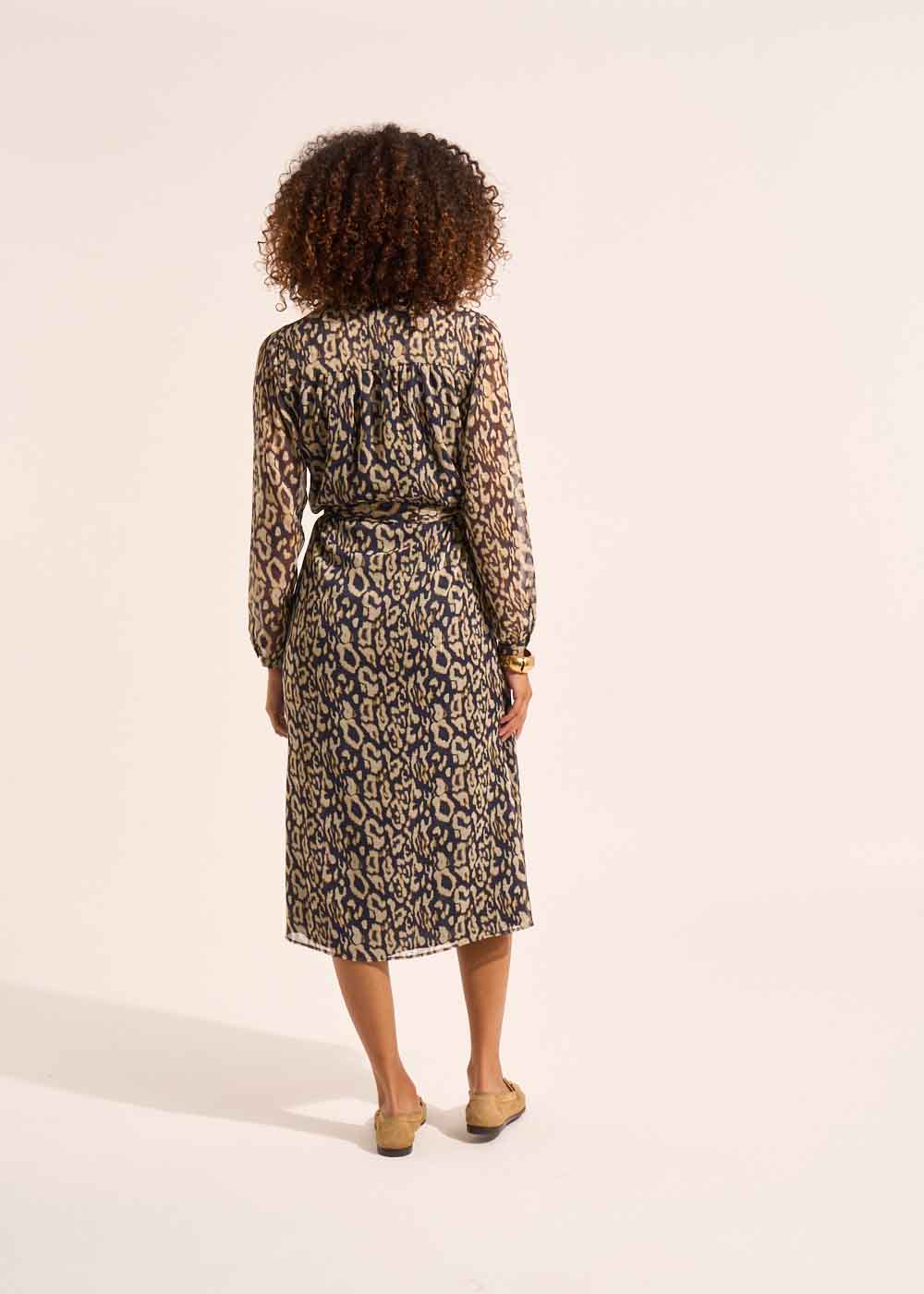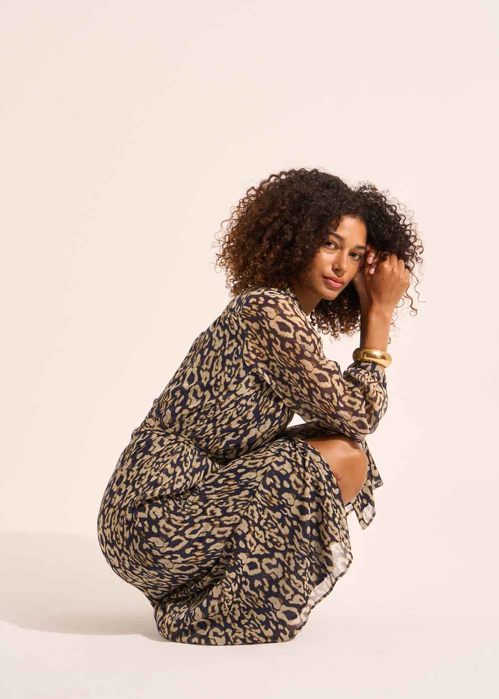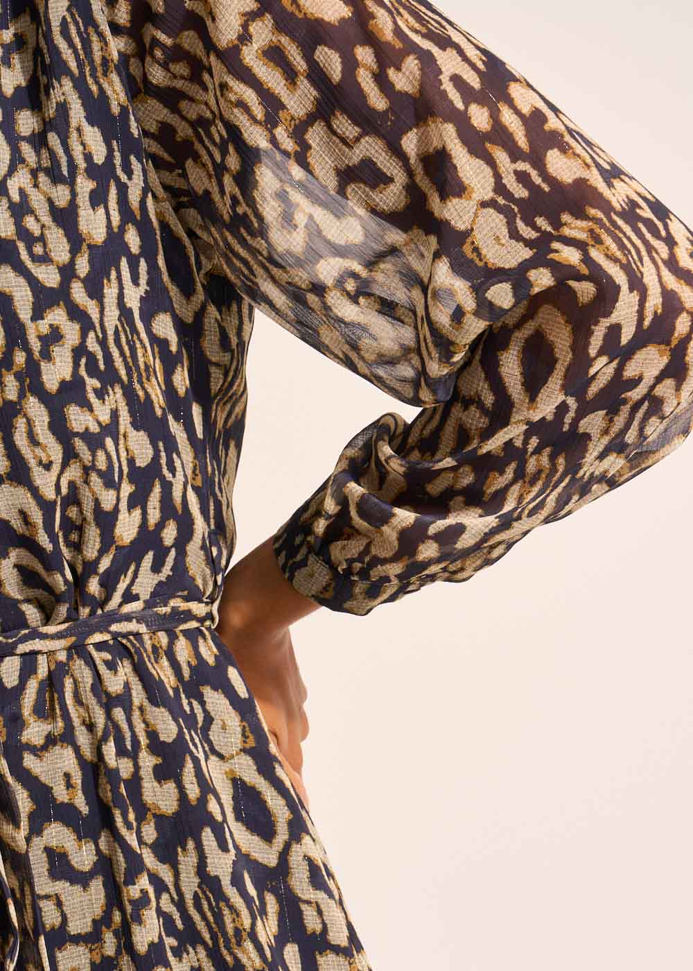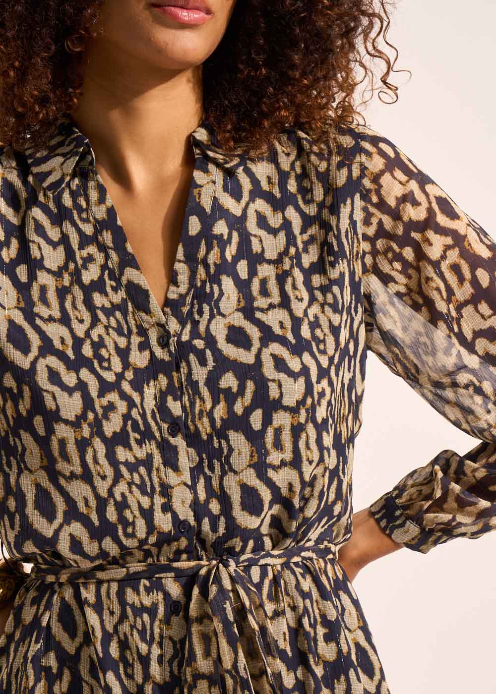 Turn heads in this sparkling leopard-print midi dress, designed to bring glamour to everyday style. Crafted from lightweight voile, it features a Tunisian collar with a V-neckline, gathered details for a flattering silhouette, and long sleeves finished with buttoned cuffs and a button-front closure. The subtle sparkle in the fabric adds just the right amount of shine, making it perfect for day-to-night looks, pair with ankle boots for a casual-chic vibe or dress it up with heels for evening sparkle. Effortlessly stylish, playful, and endlessly versatile.