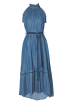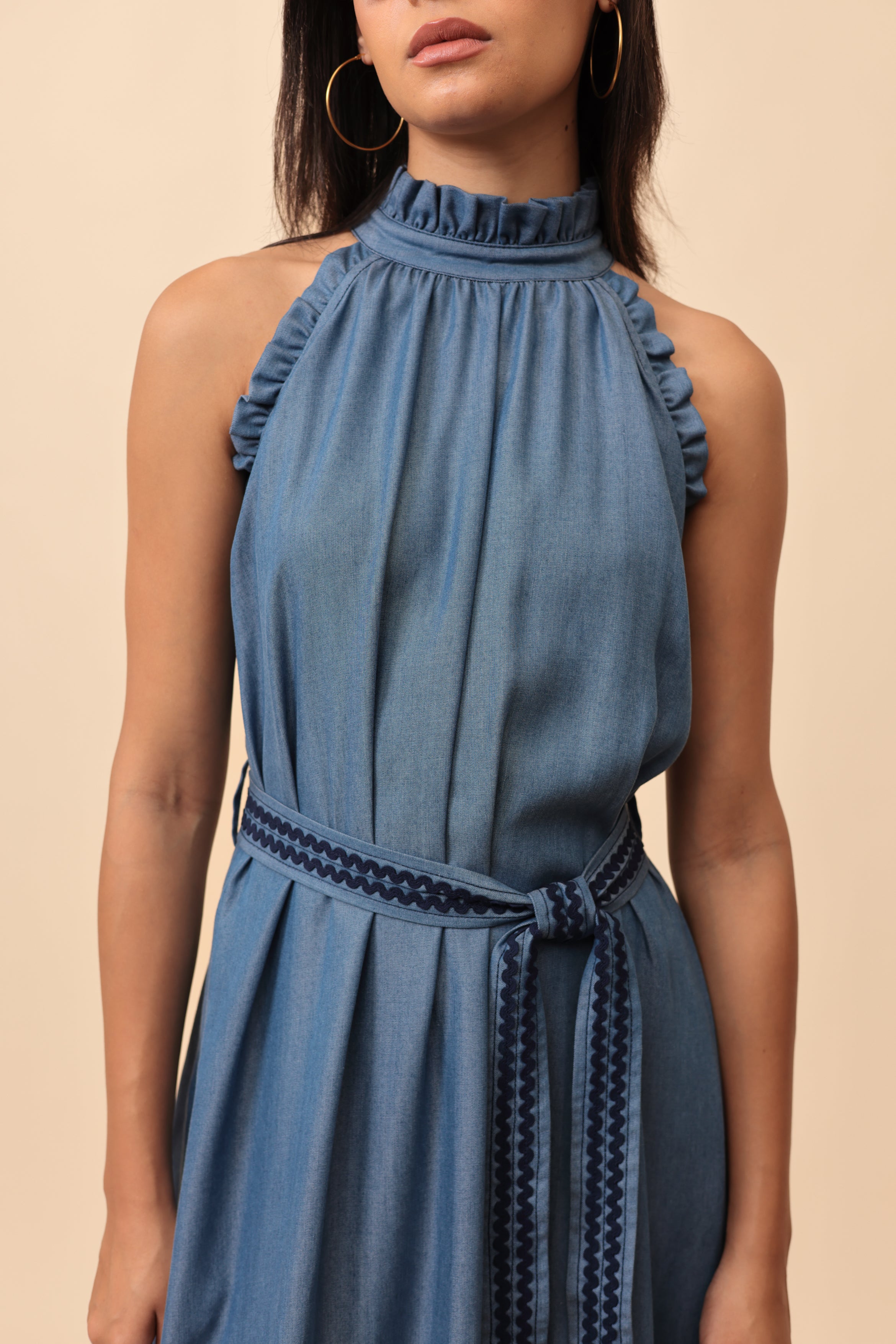 This denim dress is a one of those pieces that you'll want to wear every day. In a flattering halter neck design, this denim dress features a tiered skirt to create beautiful movement and a contrast stitch for that extra touch of style.