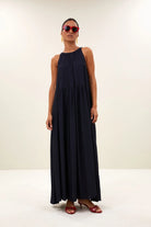 The peggy twill dress combines a casual fit with a relaxed silhouette for optimal comfort. This sleeveless long dress features a stylish round neckline and convenient side pockets, perfect for a laid-back yet chic look that moves effortlessly with you. Ideal for feeling confident and comfortable wherever you go.