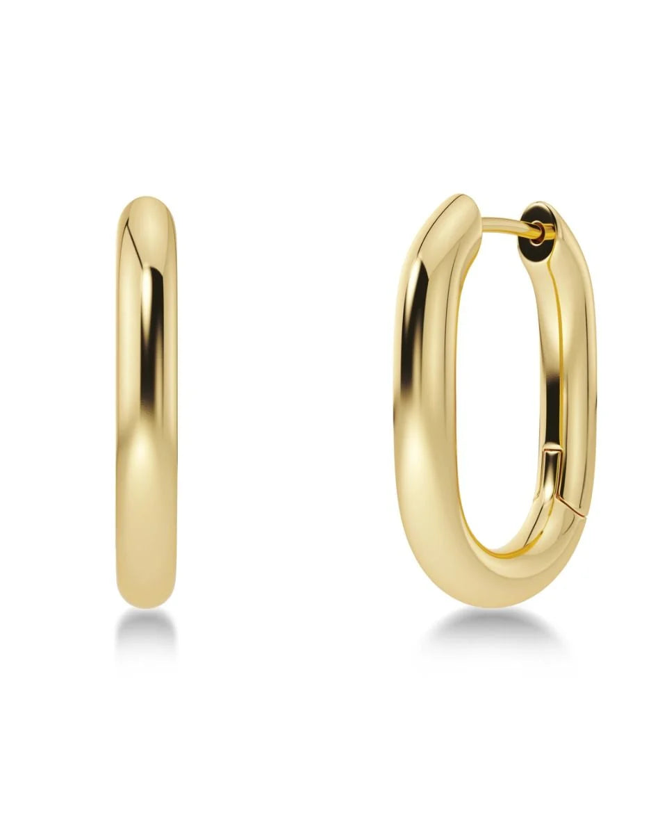 These earrings are a modern twist on your classic chunky hoops. In a oval style, these gold hoops are perfect for every day wear.