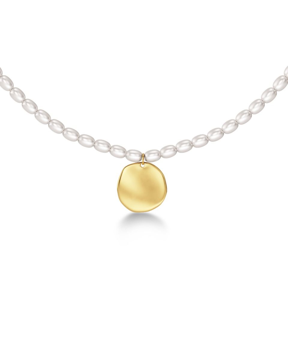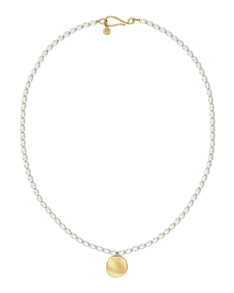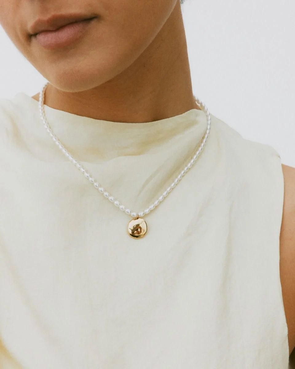 This necklace is a timeless design, with a blend of gold and pearl for a feminine addition to any style. They chain of mother of pearl beads and fluid shaped pendant, giving the necklace beautiful movement.