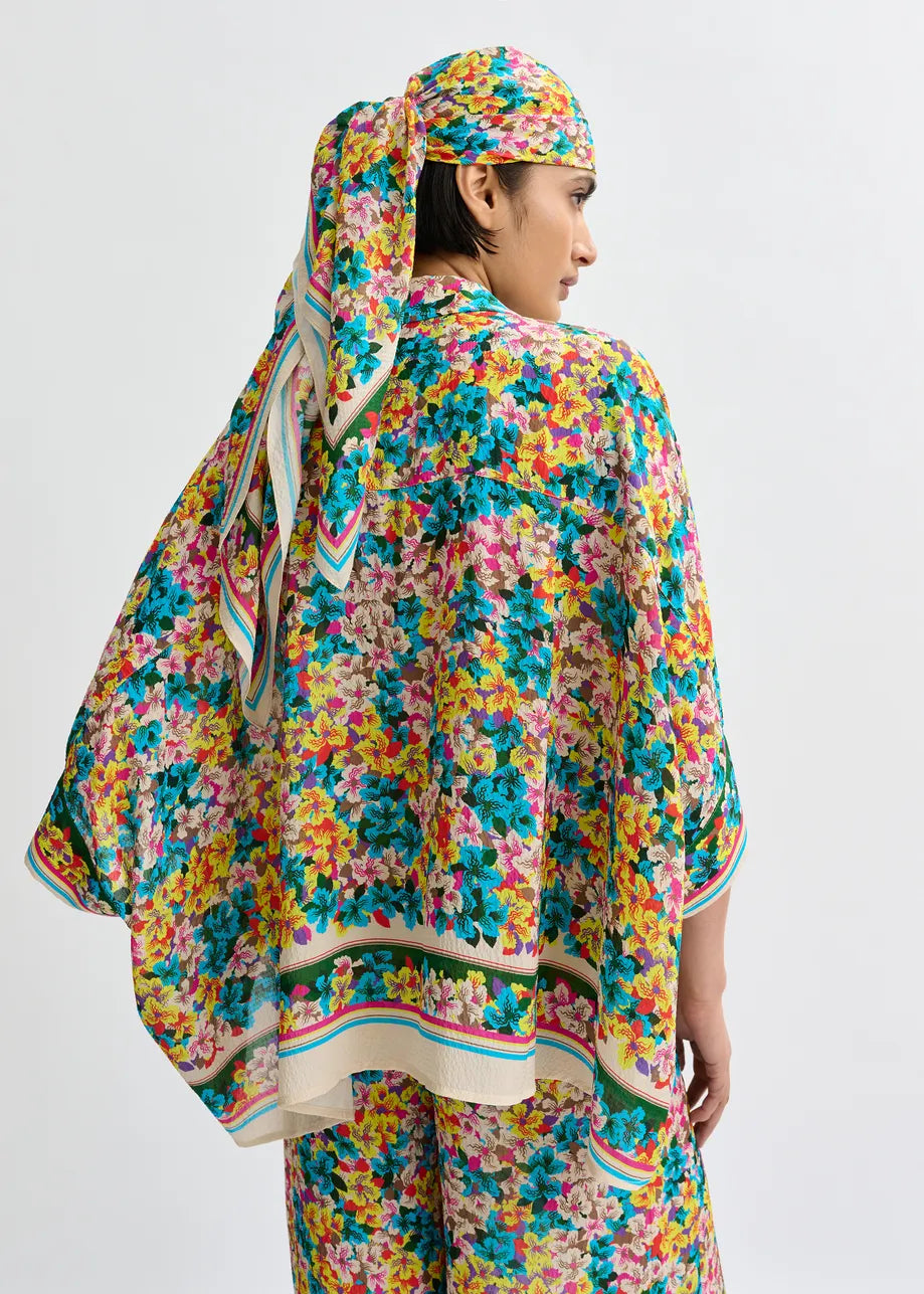 Floral-print shirt crafted from a fluid silk-blend, designed with an intentionally oversized silhouette that drapes effortlessly over the body. The wide 3/4 sleeves enhance the relaxed shape, while the button fastening adds a refined and functional detail. A lightweight construction ensures an elegant flow and ease of movement.