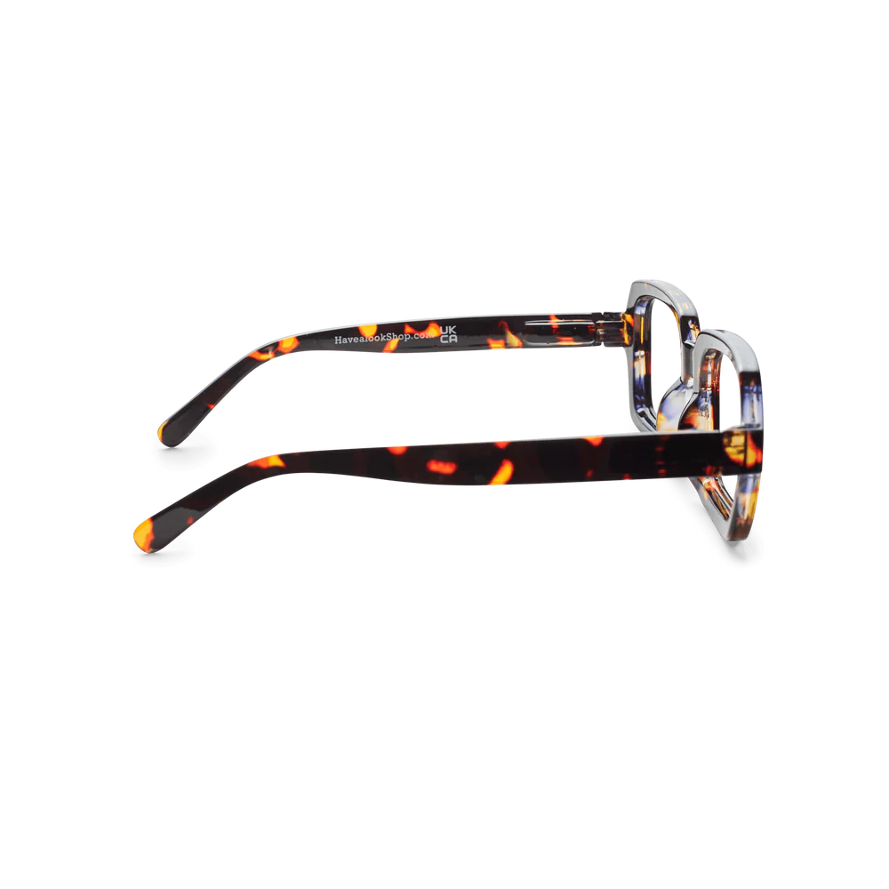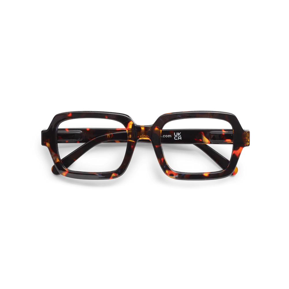 - The brown tortoiseshell frames are classic, but the graphically restrained rectangular shape gives ‘Square’ glasses a striking and edgy look