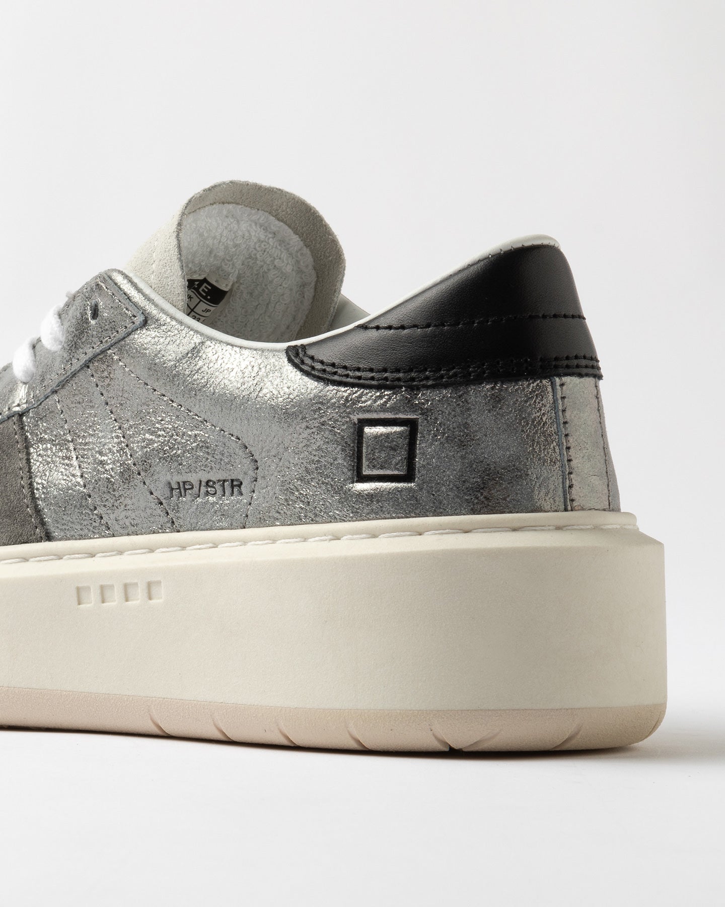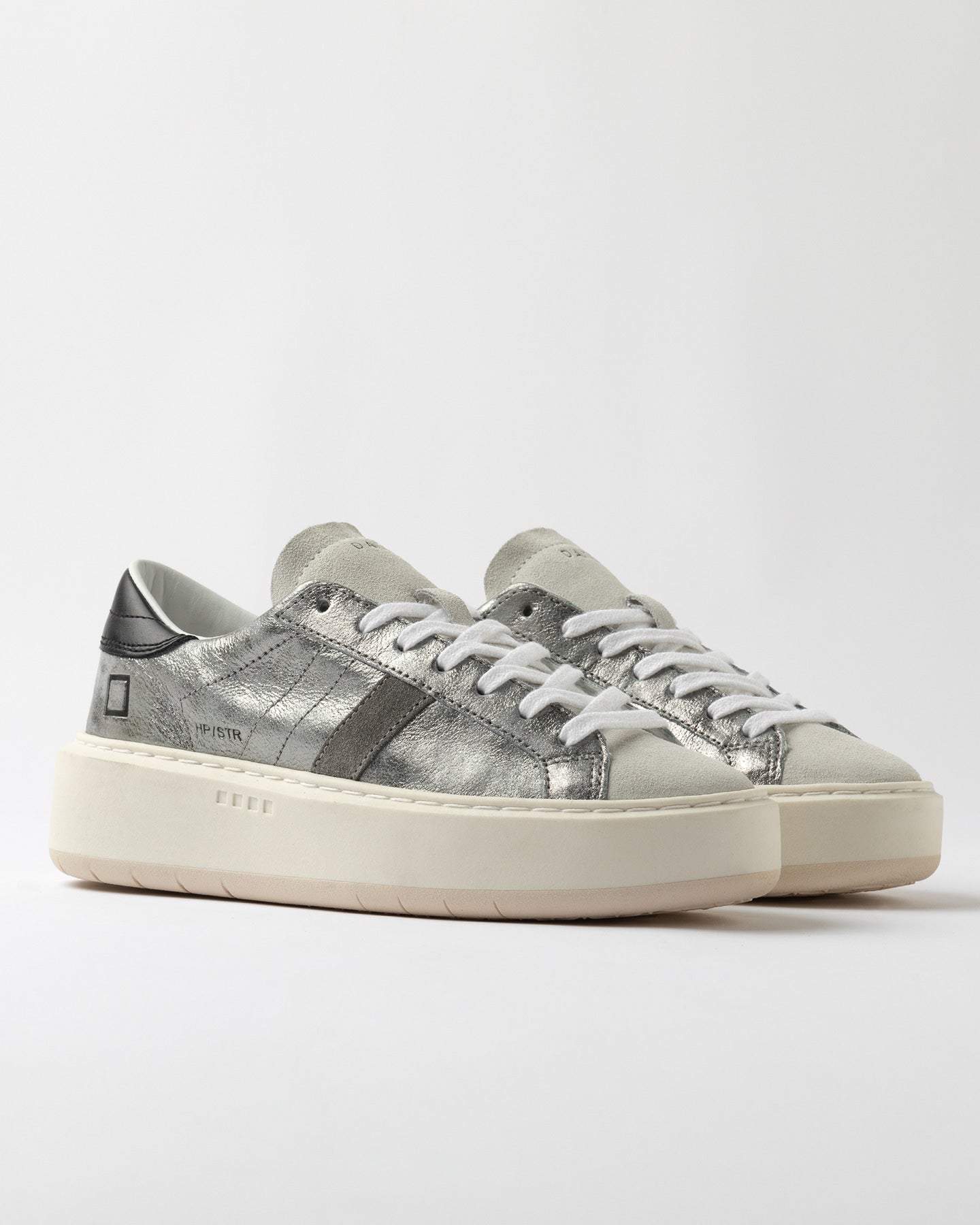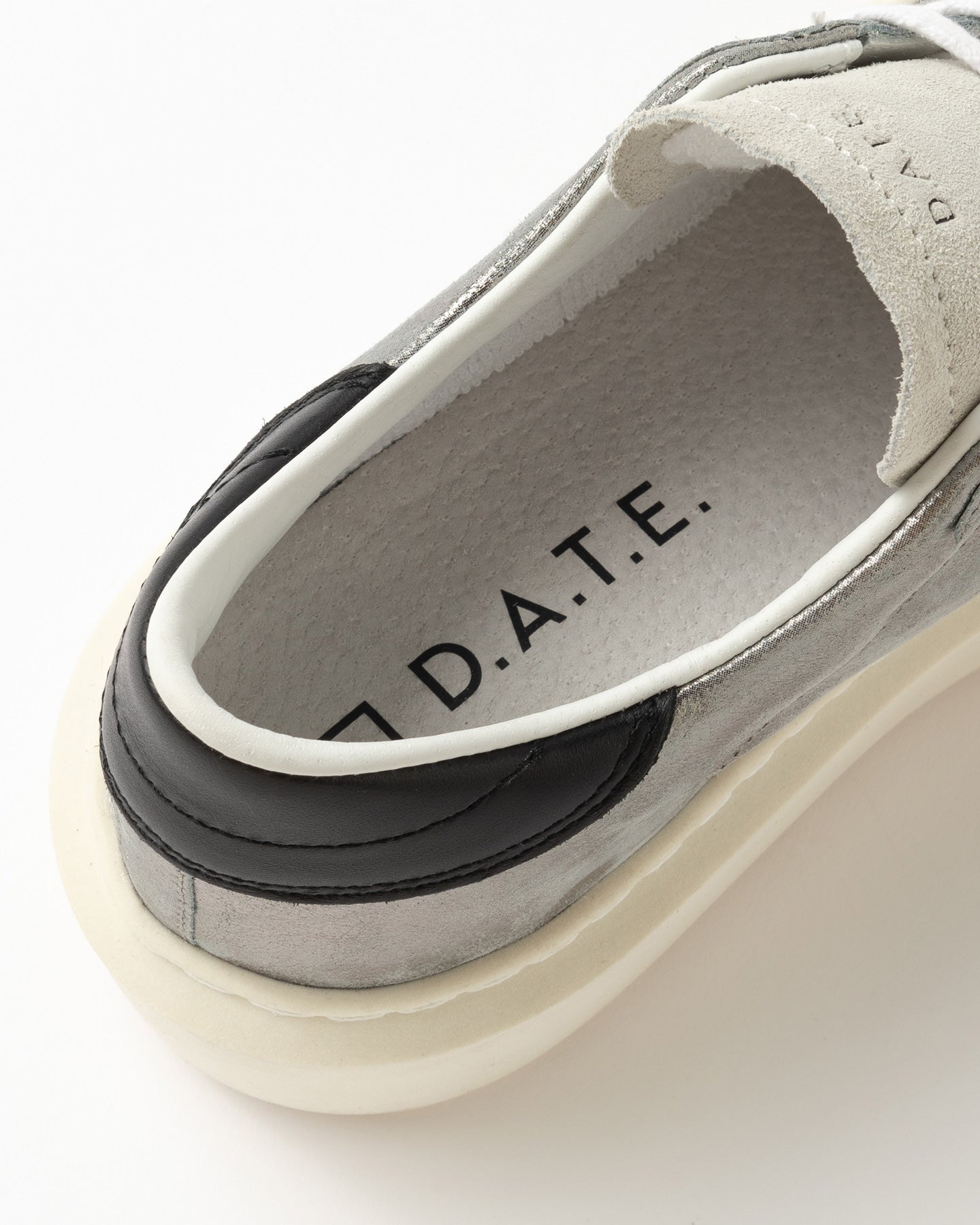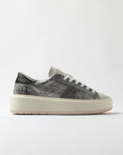 These Made-in-Italy D.A.T.E. trainers mix sporty ease with statement style. A light grey suede tongue with etched branding sets the tone, while a sleek suede side stripe and bold black leather patch keep things modern.