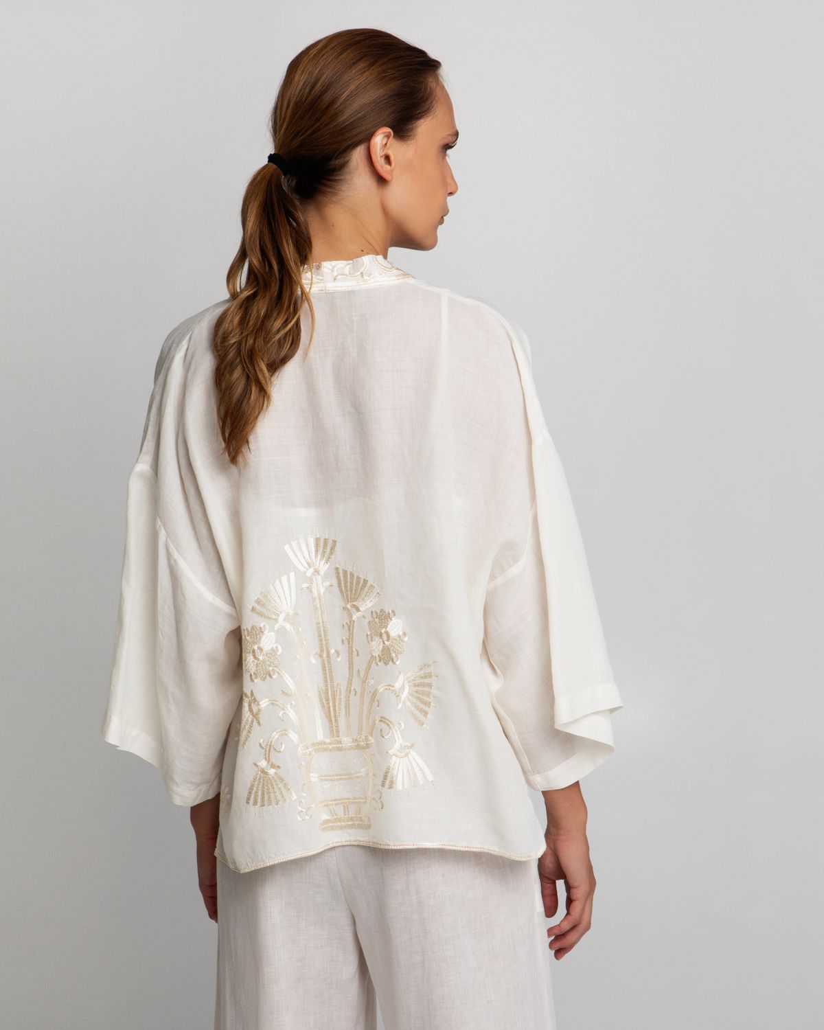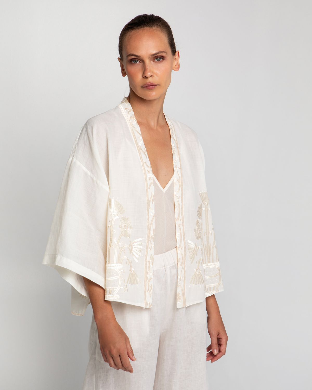 This kimono style jacket can be thrown on with any summer outfit to elevate it to the next level. With beautiful embroidery all over and an open finish, this wide sleeved jacket is lightweight for even the hottest days.
