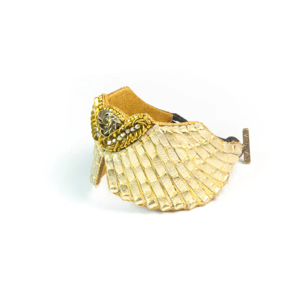 This cuff-style bracelet is shaped like angel wings and makes a real statement to a beach summer dress. With thin leather stripes and silk thread details, this bracelet is a unique addition to your collection