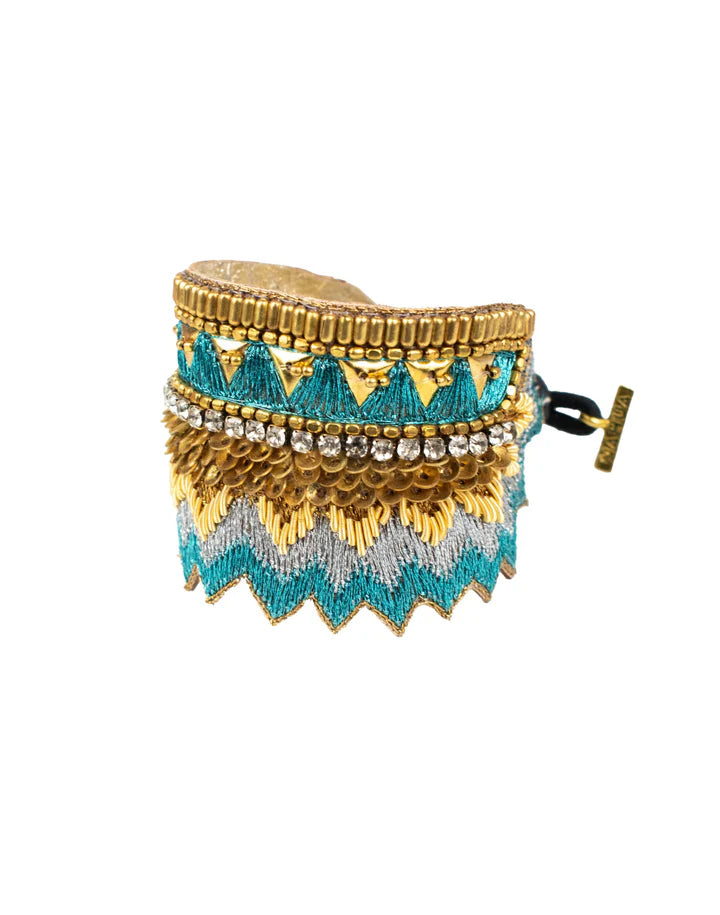 This cuff-style bracelet is a great piece of jewellery to accompany your summer wardrobe. With thin leather stripes and silk thread details, this bracelet is a unique addition to your collection