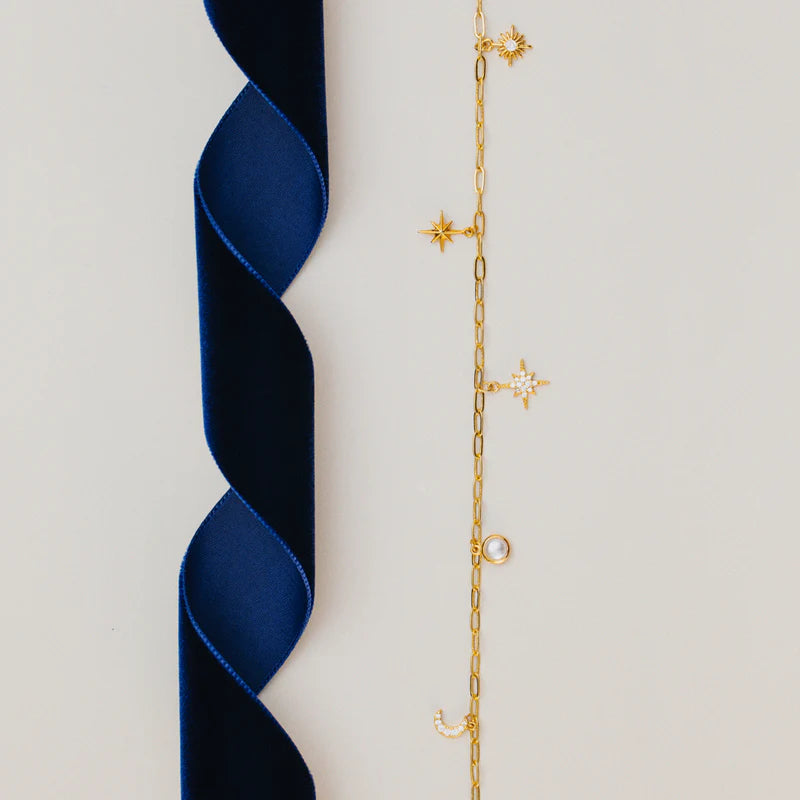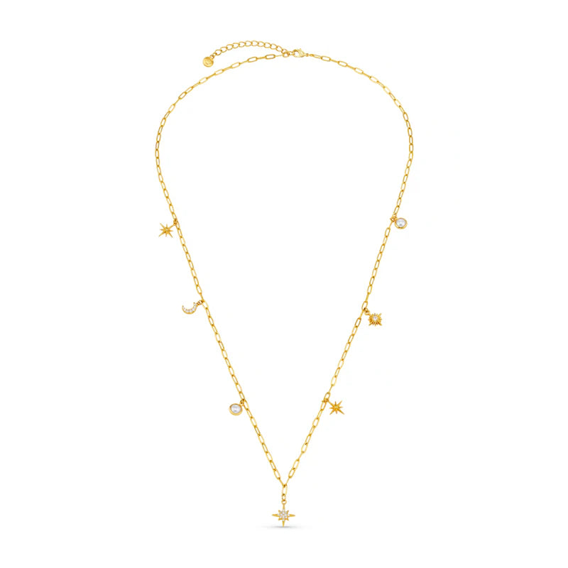 Add celestial charm to your jewellery collection with the Celestial Multi Charm Rope Necklace. Featuring seven delicate charms — from starbursts to moons and pearls — spaced along a long gold‑plated rope chain, this necklace is perfect for everyday wear or adding subtle sparkle to evening outfits.