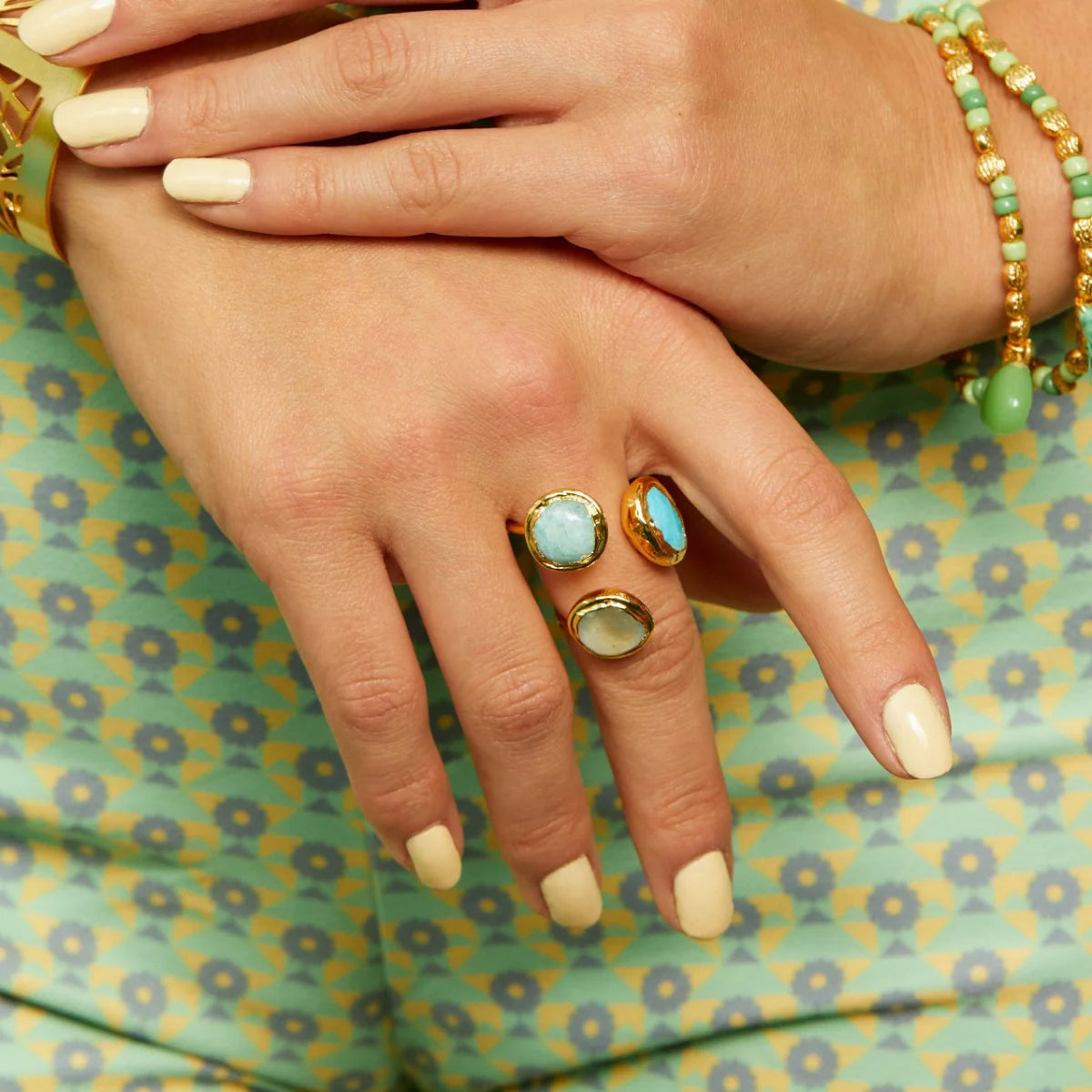 This statement gold ring is the ultimate pop of colour for your outfit, with three gemstones hand faceted you're sure to make a statement. Adjustable for any finger, this piece is a must-have.