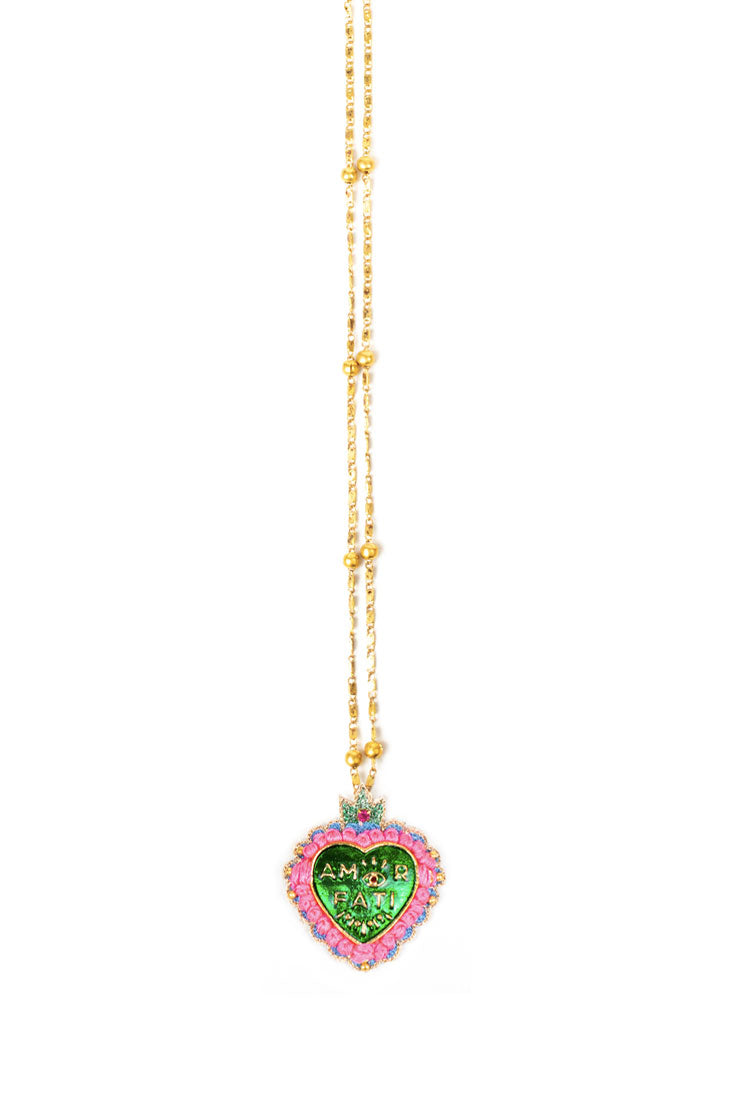 This sweet heart-shaped necklace is hand-embroidered with a silk thread. It makes the perfect statement for a simple look and the coloured brass heart detail adds a real unique twist. Layer with simple chains and match with the Amor earrings to complete the look.