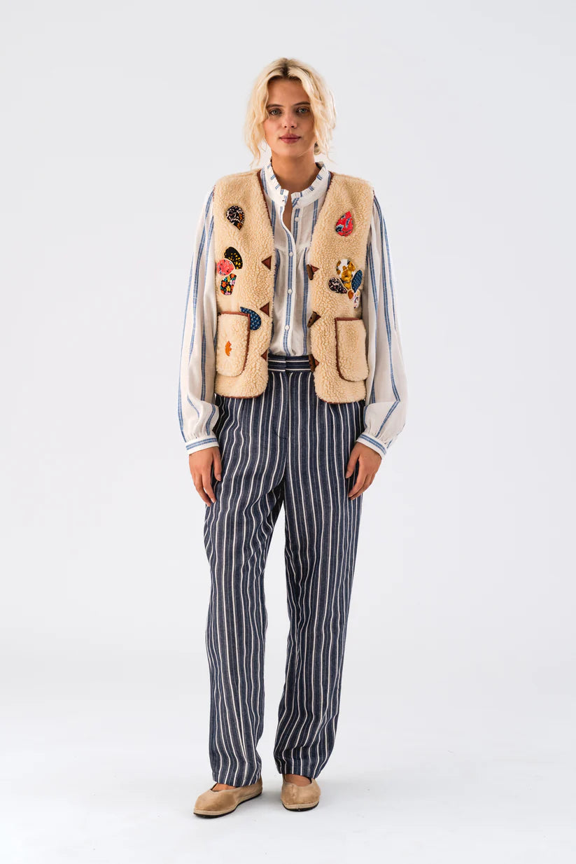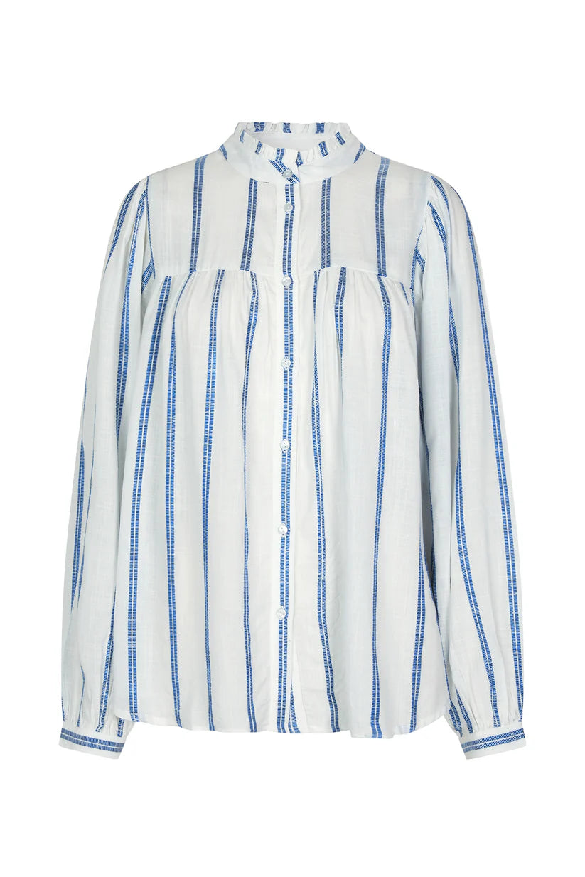 Upgrade your wardrobe with our fashionable Cara Shirt. Its timeless design features a standing collar, stripe pattern, and ruffle neck for added style. Button up for a chic look that will never go out of fashion.