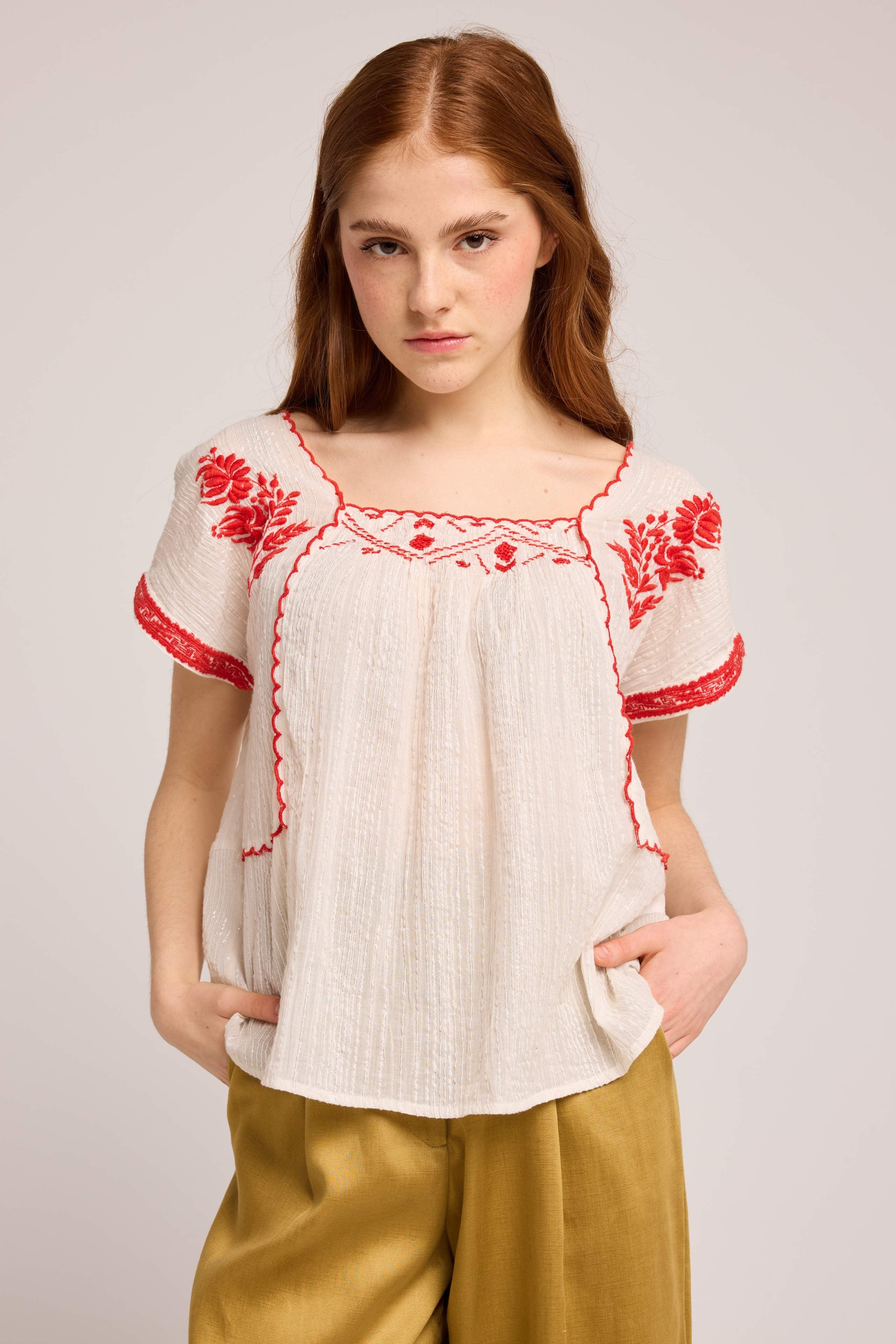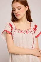 This summer blouse brings bohemian style to any look, perfect for bringing some laid back luxury into your wardrobe. With embroidery details and a relaxed finish, this blouse can be worn with jeans, linen trousers or a floaty skirt all summer long.