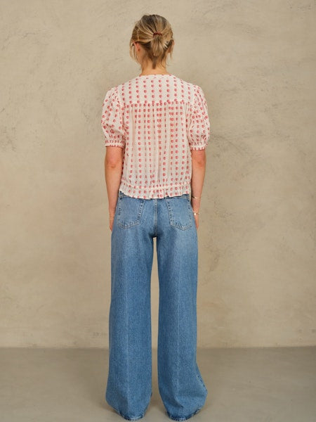 Elevate your everyday wardrobe with the Karla Gathered Top in a striking ecru and red colourway. This refined blouse features thoughtfully gathered detailing that creates movement and visual interest, perfect for layering or wearing solo. The sophisticated colour combination works seamlessly with neutral basics or bolder pieces, making it a versatile addition to any closet. Crafted for comfort and style, this top transitions effortlessly from office to weekend wear.
